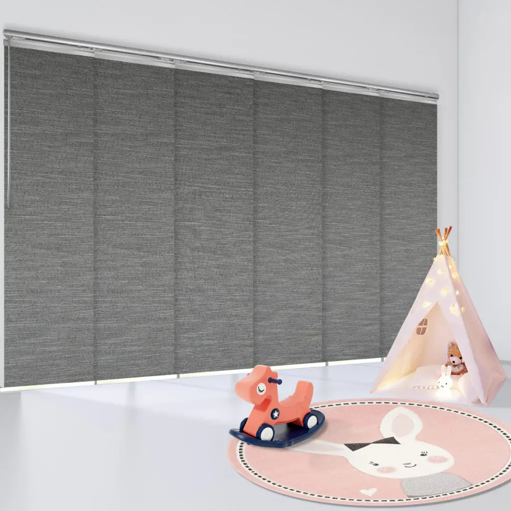 Central Design Products is pleased to introduce a new innovative panel track that offers easy 2-way installation, adding an alluring style and refined touch to your home decor. The single rail design of the track is sleek, compact, and reduces the overall footprint and weight of the installation, eliminating bulky, intrusive window treatments. Adjusting the panel height is a breeze � simply trim the panel, re-attach the liner, and install the panel weight. Detailed instructions are included.The panel track also features a patented slider design, made with aluminum and fitted with bearings that allow for durable and smooth operation. The sliders are stacked closer together than conventional panel tracks, reducing light bleed coming from the gaps between panels. This track has endless uses from dividing rooms, garages, offices, and closets to decorating windows and patios. Available in larger sizes including 8, 10, and 12 panels. Extends from 98-130� wide. Each panel measures 23.5" wide and 91.5" tall, with a total installation height of 94" (includes the 2.5" rail track). The track can be wall or ceiling mounted. The panels can stack on the left or the right. The clearance from the wall is extendable from 1.25� to 3.25� and projection from the wall is extendable from 3� to 4.25�. Tahla panel is made from 70% Polyester 30% Acrylic, with a blackout shade.