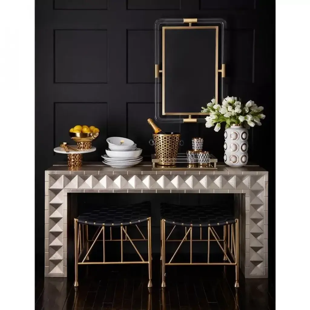 Crafted from nickel-plated metal with hand-stamped patterns applied to a minimalist, modernist form. The surface is reminiscent of silver leaf—it emits that same lustrous glow—but is wonderfully durable. Perfect for adding a regal, rich hippie vibe to your Park Avenue penthouse entryway or a bit of twinkly glamour behind a sofa in your downtown loft.