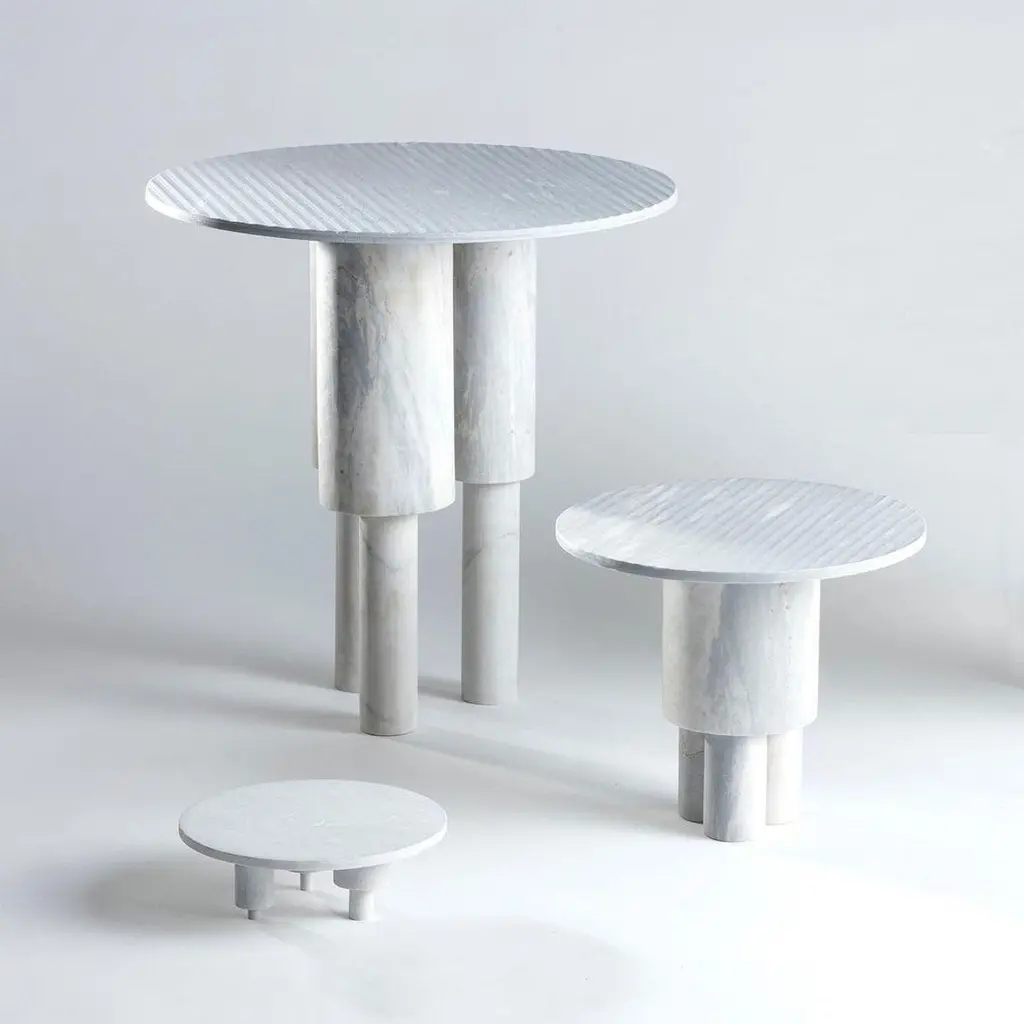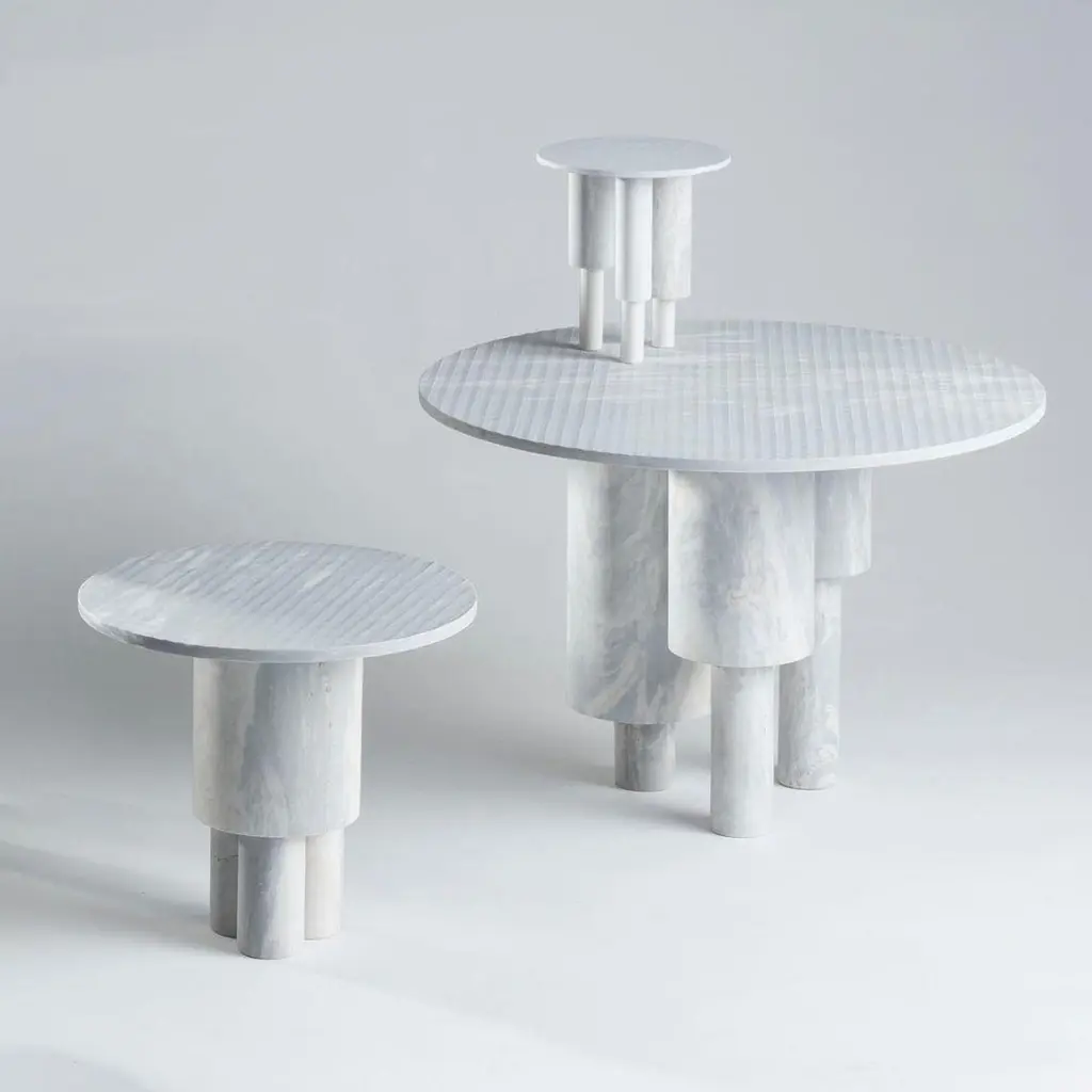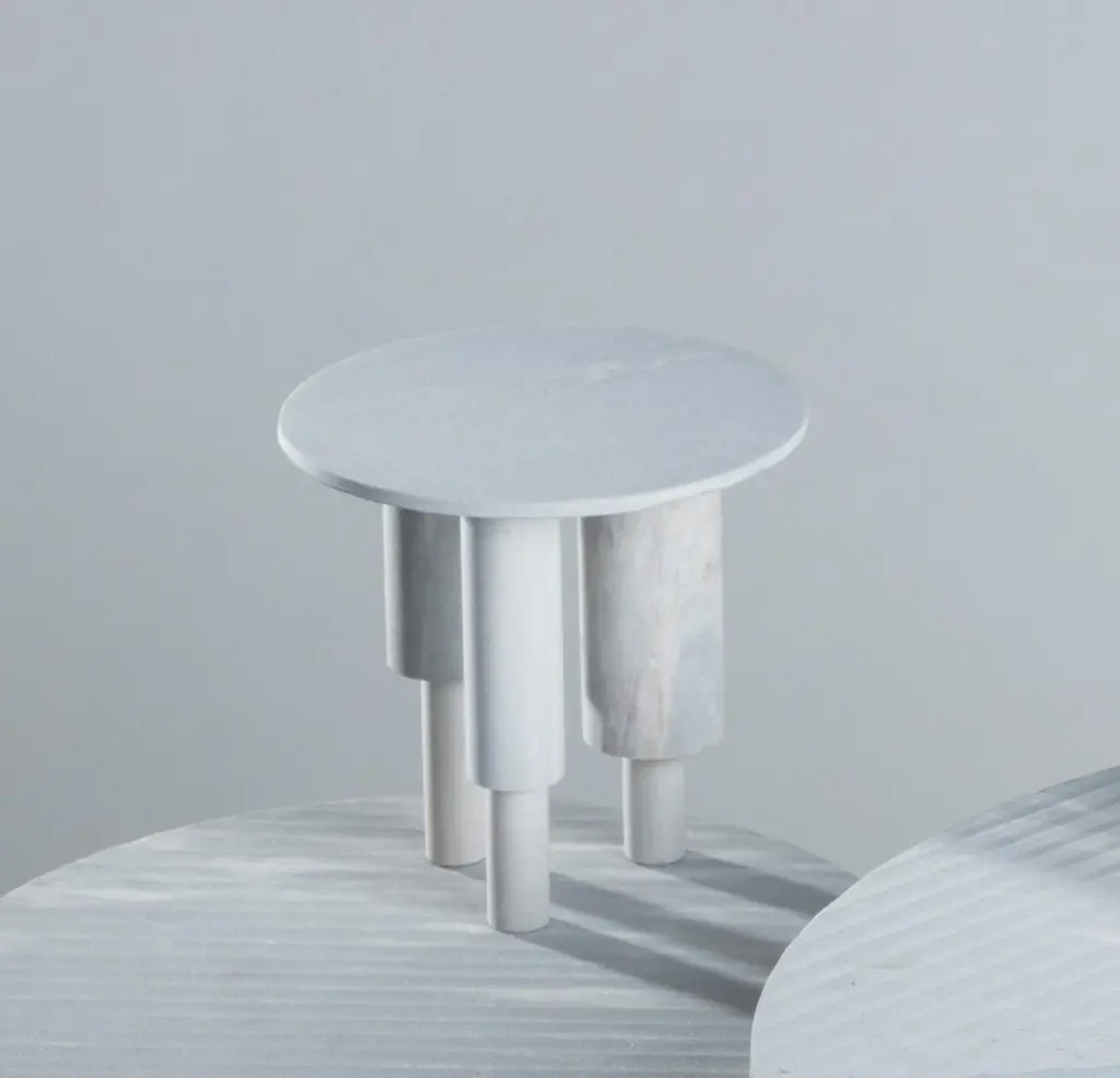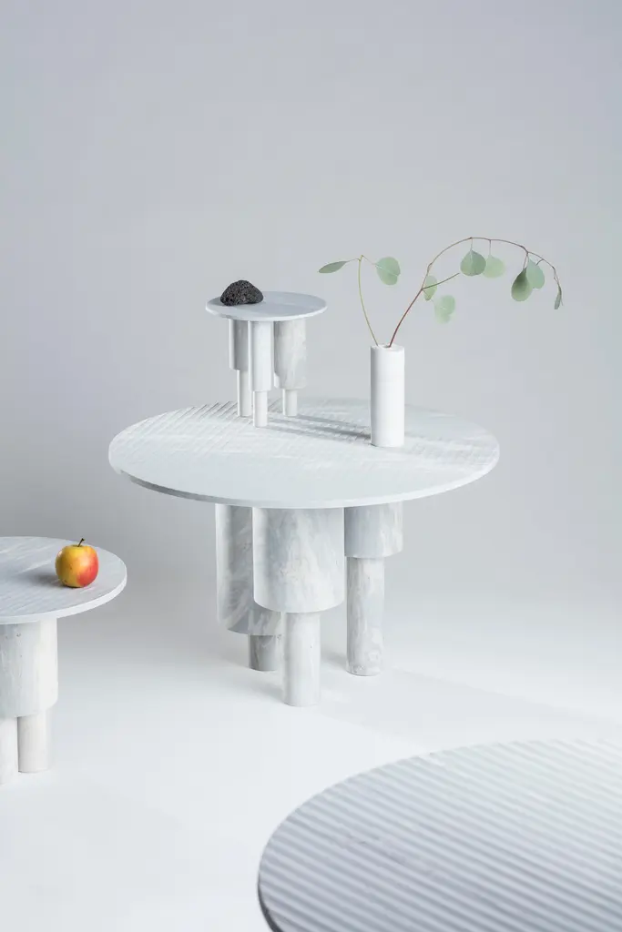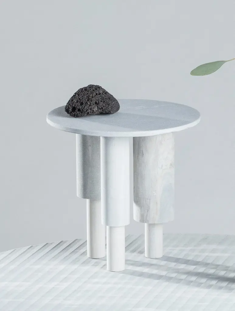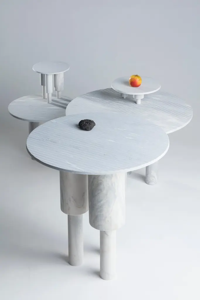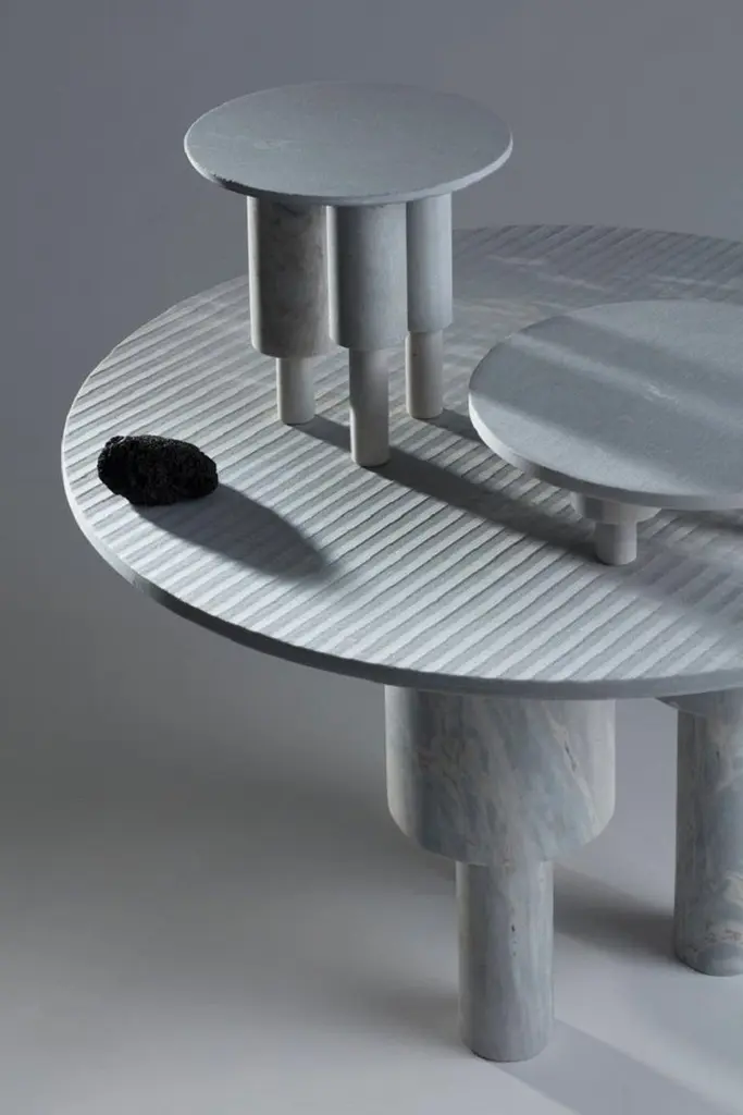 Tall game of stone marble center piece by Josefina MunozGame of Stone Collection.Dimensions: H 12 x Ø 20cm.Material: marble Palissandro Blu Nuvolato.Also available in low center piece.Interpreting the expressiveness of stone offcuts, from a block to a fragment and reintegrate them into a dynamic, organic process. A poetic and delicate vision of Josefina Muñoz and Pietre Trovanti, that explores the elegance that comes to life from the imperfect stone, turning into a home decor collection.In GAME OF STONE Josefina Muñoz, designer based in Geneva, Switzerland, transform an uneven block into a handcrafted collection of small tables with different heights, alternating in a play of shapes and compositions with a playful character. The finishing of the surface, in the light or in the shade, create rhythmic configurations. The work of Geneva-based Argentine designer Josefina Munoz, takes a macro perspective to the world of contemporary design and the influential sometimes seemingly distant factors that determine the industry’s course. With training in Design for luxury and Craftmanship, she designs with a keen sense of underlying meanings and symbolism that go hand in hand with quality. Nominated for Swiss Design Awards 2019, Winner of the Art & Design Indosuez Award 2019 of the Art and Crafts Switzerland Association, she participated in exhibitions around the world, including the Milan Design Week (2016, 2017, 2018) “De Mains de Maîtres” in Luxembourg (2017), the London Design Festival at the Victoria and Albert Museum in 2015 and Collect 2019 at Saatchii Gallery in London. Her personal work in close partnership with true artisans in different fields, finding the particularities of individual expertises that offer a whole new world of artistic expressions. With her creations, she aspires to give the opportunity for the viewer to live a moment of serenity. As a designer, she seeks to inspire, inform and provide a voice to artistic professions such as ceramic, stone and glass, among others. After starting her own studio in 2016, she is perpetually seeking out new experiences and collaborations around the world.