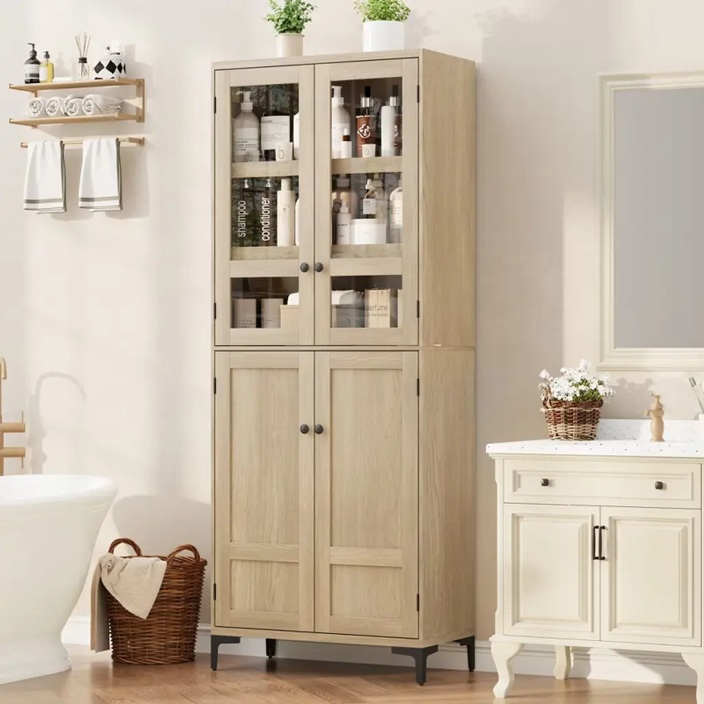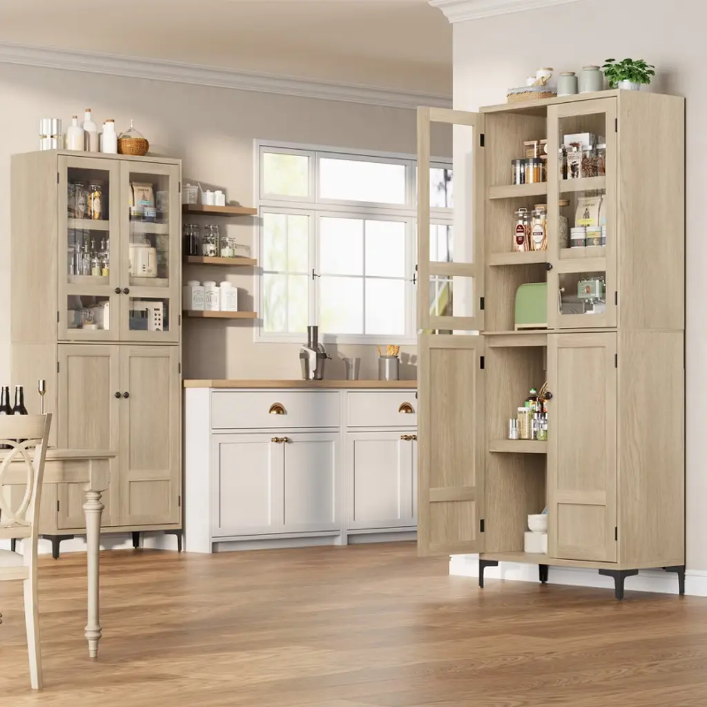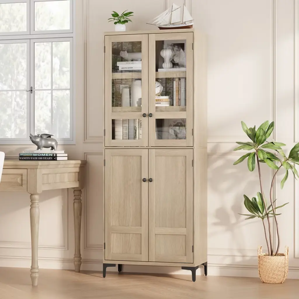 Tall Kitchen Pantry Cabinet with Glass Doors, Food Storage Cabinet with 4 Doors 5 Tier Adjustable Shelves for Kitchen, Dining Room, Bathroom (Pear Wood)