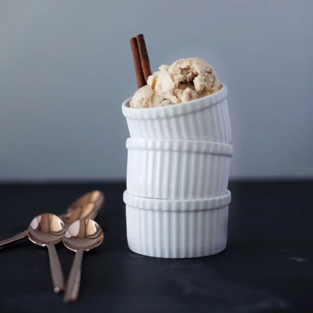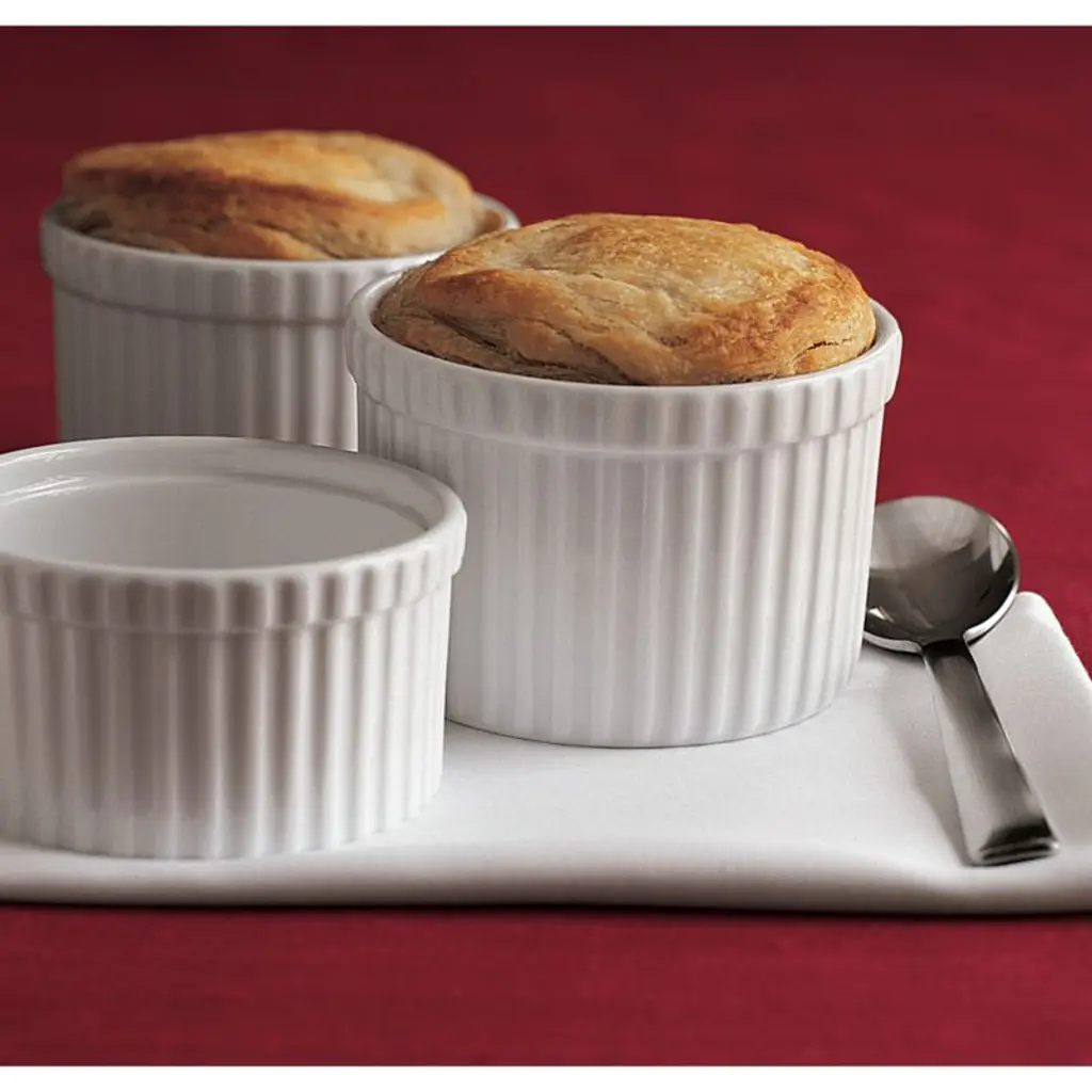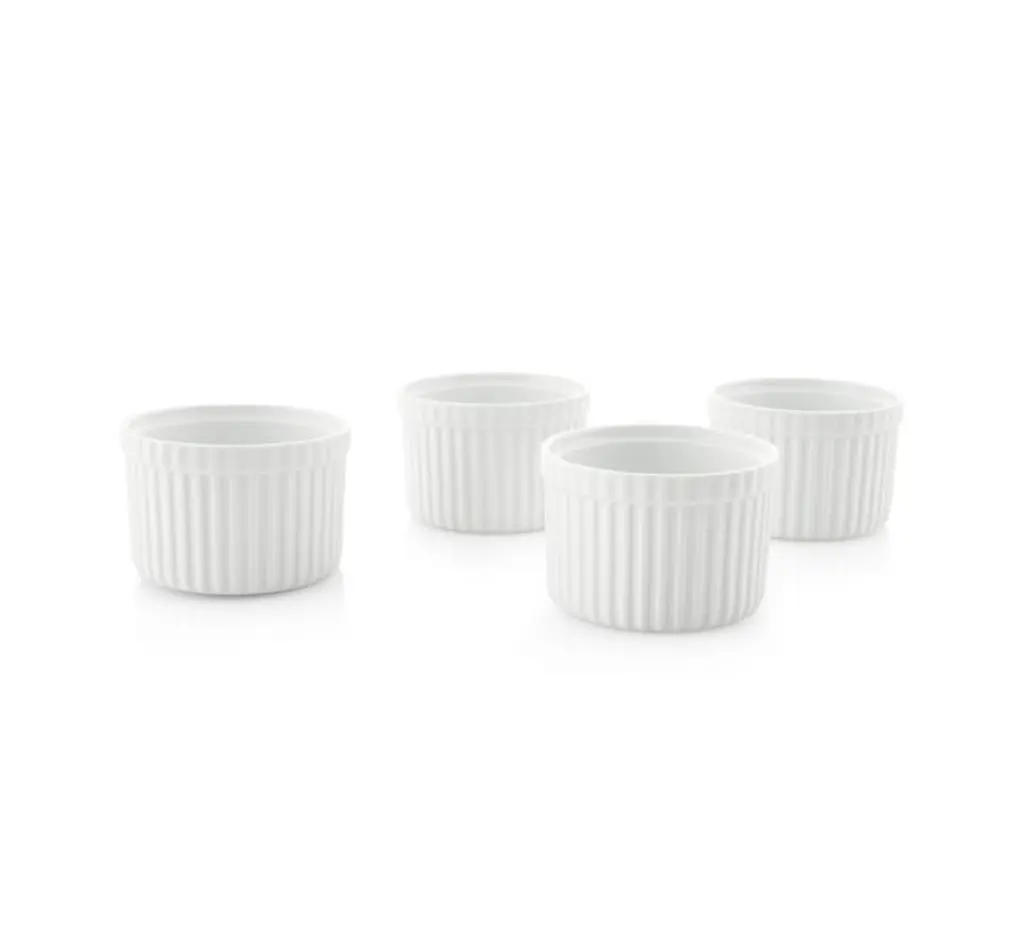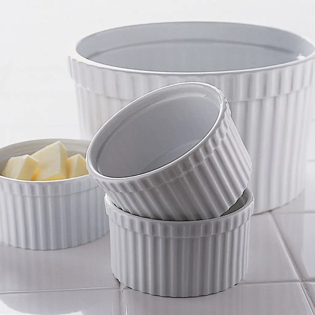 Durable, ribbed white porcelain adds classic style to a variety of foods. Tall ramekin can be used to bake individual desserts, serve snacks or pre-measure cooking ingredientsthe uses are endless.