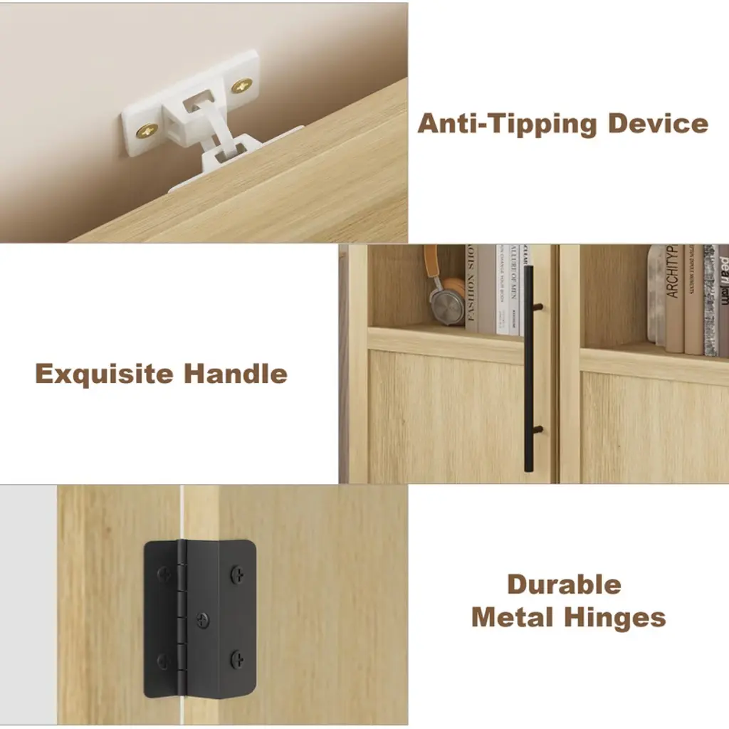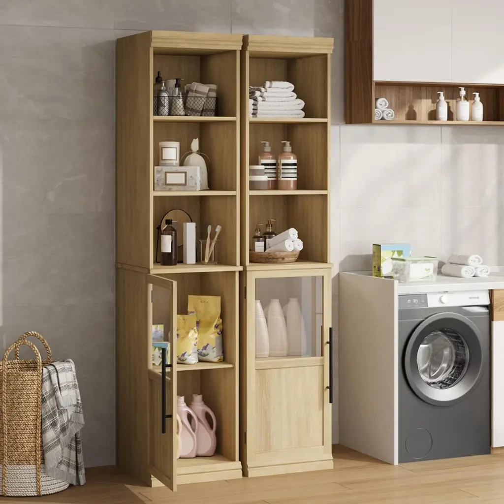 Tall Storage Cabinet with Door, 70" Slim Freestanding Bathroom Cabinet with Adjustable Shelves for Small SpacesProduct Details:Space-Optimizing Vertical DesignEngineered for compact living, this cabinet features an ultra-slim profile measuring just 15.7 inches wide and 14 inches deep. Standing 70.3 inches tall, it maximizes vertical storage capacity, making it the perfect organizational solution for tight corners in bathrooms, narrow kitchen spaces, or cozy living room nooks where floor space is limited.Hybrid Open & Closed StorageEnjoy the best of both storage styles with a versatile layout that combines three open shelves with a single glass-door compartment. This configuration allows you to display frequently used items or decorative pieces while keeping clutter concealed and dust-free, creating a balanced and visually appealing storage solution.Fully Customizable InteriorAdapt the cabinet's interior to your exact needs with multiple adjustable shelves. Easily reconfigure the shelf heights to accommodate everything from tall kitchen containers and bathroom toiletries to books and decorative objects, ensuring optimal space utilization for items of all shapes and sizes.Durable & Secure ConstructionBuilt from high-quality engineered wood with a natural wood grain finish, this cabinet offers both aesthetic appeal and lasting durability. The included anti-tipping device ensures enhanced stability and safety when properly anchored to the wall, making it suitable for family homes and humid environments like bathrooms.Multi-Room Functional VersatilityThis cabinet's adaptable design and neutral natural finish allow it to blend seamlessly throughout your home. Use it as a bathroom vanity for toiletries, a kitchen pantry for dry goods and dishes, or a living room organizer for books and media accessories. Its slim footprint makes it an ideal storage solution for apartments, condos, and small homes.Specifications:Material: Engineered WoodColor: NaturalStyle: FarmhouseConfiguration: 1 Glass Door Compartment, 3 Open ShelvesSpecial Features: Adjustable Shelves, Anti-Tip DeviceMounting Type: Freestanding (Wall-Anchorable)Recommended Uses: Bathroom Storage, Kitchen Pantry, Living Room OrganizerOverall Dimensions: 15.7"W x 14"D x 70.3"H