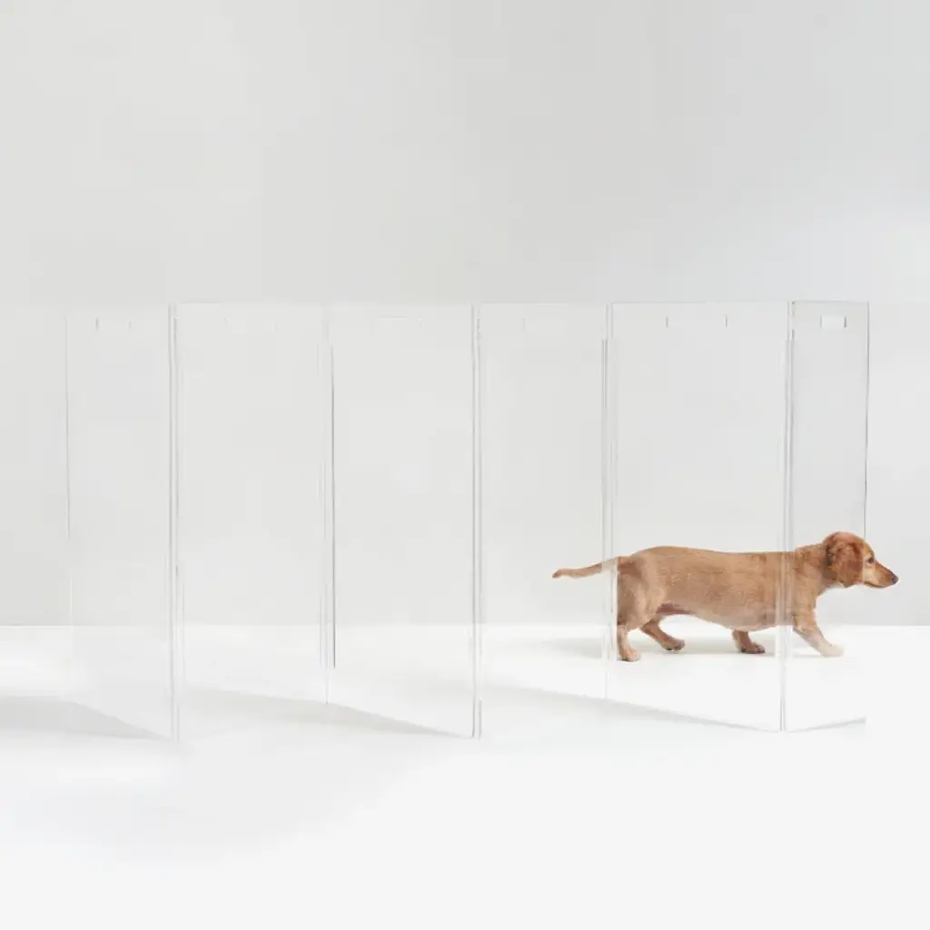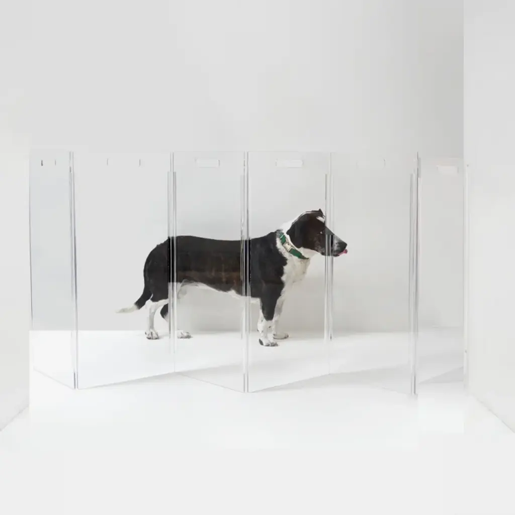 A freestanding pet gate like no other! This panel, adjustable pet gate provides total visibility and is designed to confine your pet safely in areas with larger openings. The panels fold together and handles on top provide easy transport and storage. Use in any doorway 125"w or less, including your staircase.