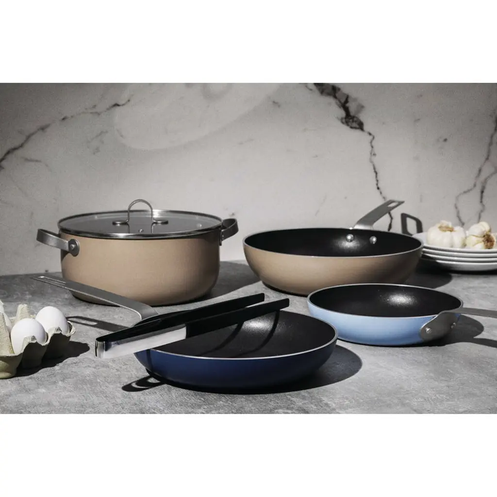 Alessi's Tama cookware set upgrades your entire kitchen pot collection in a single shot. The stylish set includes five pieces: a casserole with handles, two different-sized frying pans, a wok and a glass lid. The set is completed with kitchen tongs, made of stainless steel, that make frying instantly easier and more comfortable. All Tama pots and pans are also suitable for induction hobs. The Tama collection, designed by Giulio Iacchetti, includes pots, pans and other cooking utensils that will delight kitchens with their practicality, beauty and pleasing color palette.