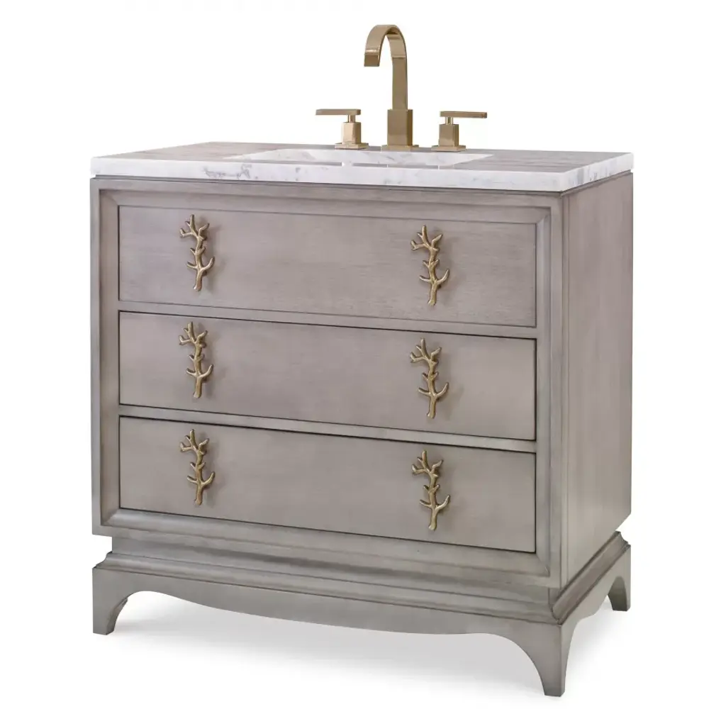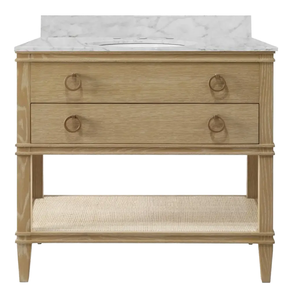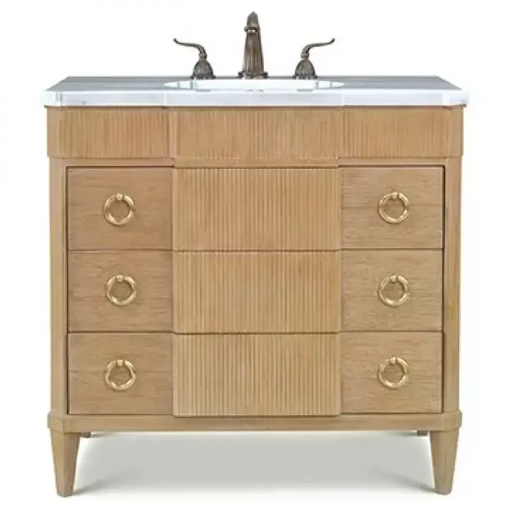 This sink chest features Oak solids with a ceruse finish. Three drawers with a reeded center detail are finished with polished brass ring pulls. Statuario Angel marble top. Porcelain sink installed.