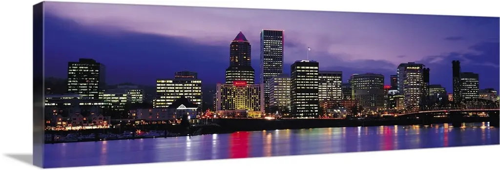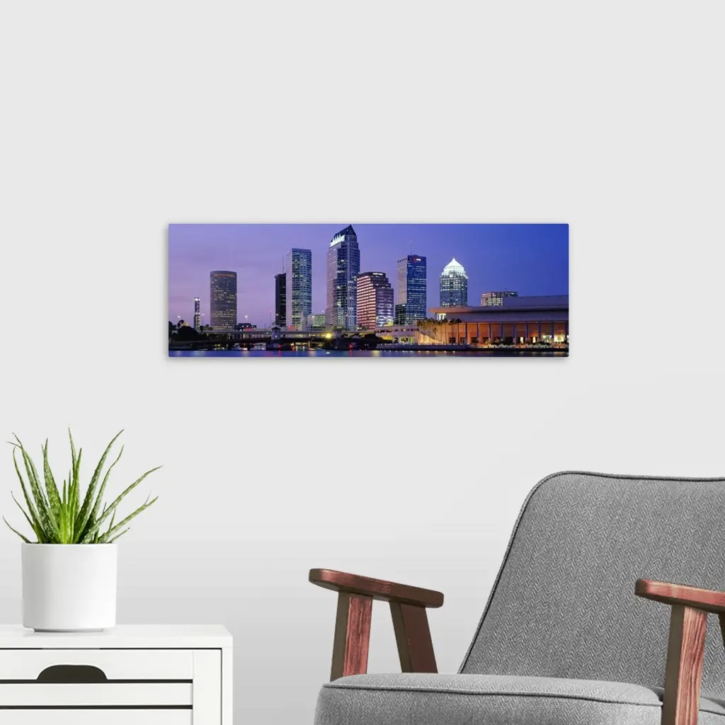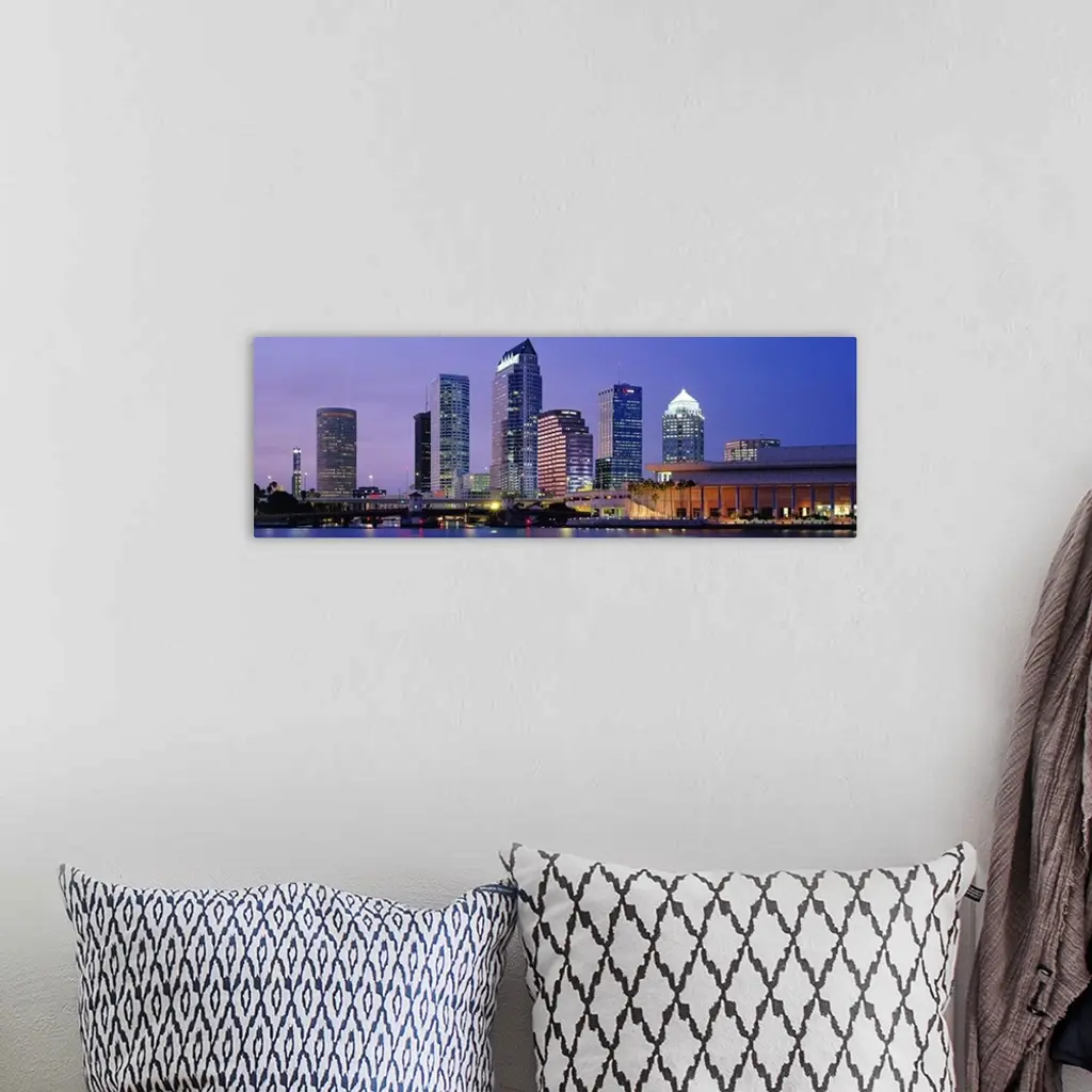 Wide angle photograph of the Tampa skyline in front a vivid sky, lit up at night and reflecting in the water.