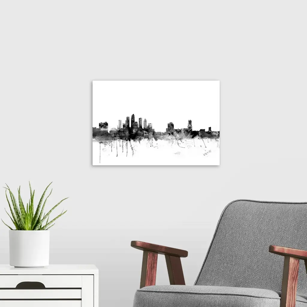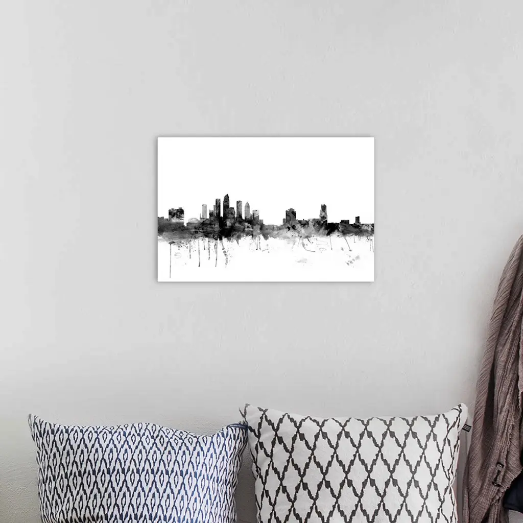 Smokey dark watercolor silhouette of the Tampa city skyline.