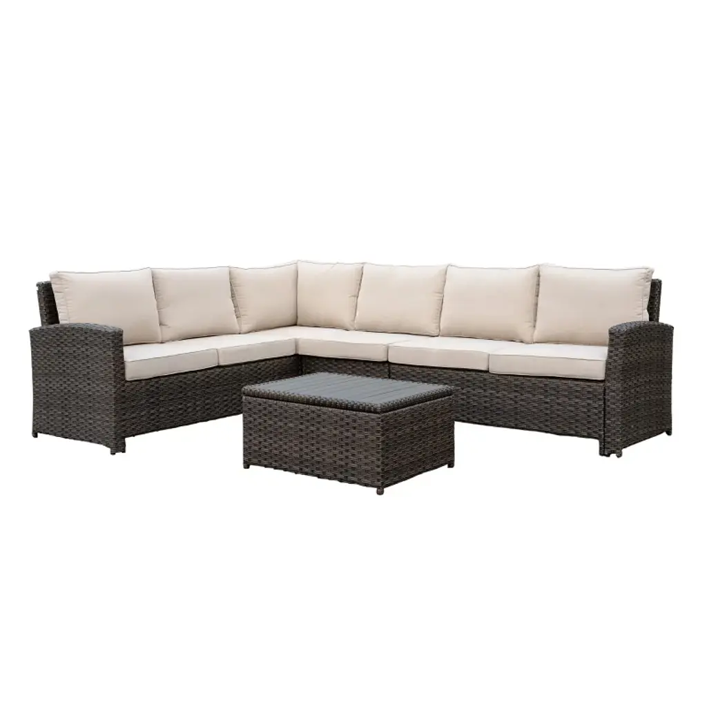Tamyra 7 Piece Wicker Sectional with the weather- resistant Tamyra sectional! Resin wicker and solution-dyed fabric covers are stain and fade resistant and built for the outdoors but with the comfort you expect from regular upholstery. 6-inch cushions are ultra-comfortable and removable for when the weather gets bad. The Corner Table features a removable glass top with an umbrella hole and a door on the back for storage. Upholstery with indoor looks but built so you can enjoy the great outdoors!