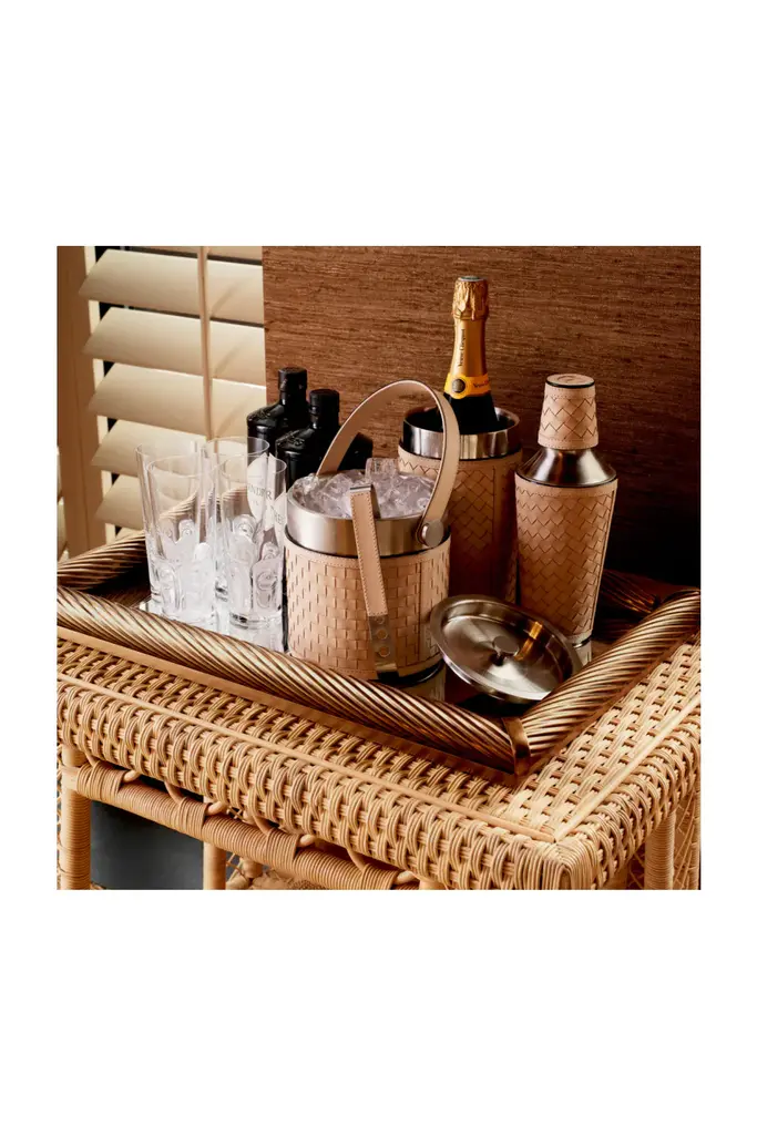 This set of 3 includes a stainless steel ice bucket, a stainless steel cocktail shaker, and a stainless cooler, all elegantly wrapped in tan leather. The leather handles add both style and convenience, making it effortless to serve your favorite drinks. Elevate your entertaining experience with this iconic set, blending timeless luxury with modern design.