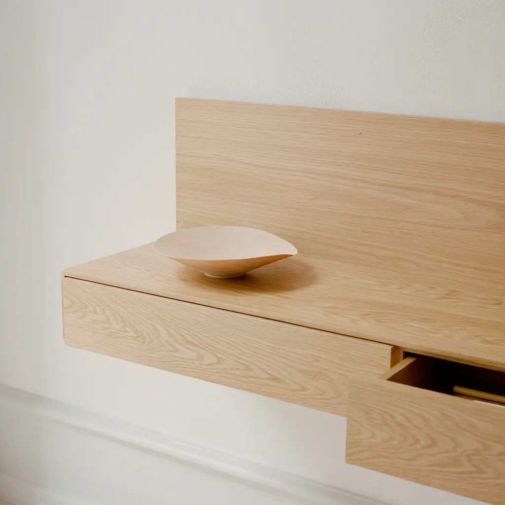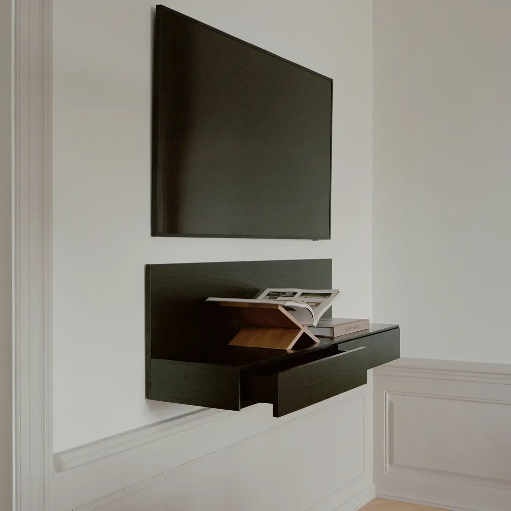 Featuring a spacious drawer and open shelving, The Tana Wall Mounted Media Module by New Works is ideal for organizing media devices and accessories. The space saving wall-mounted design highlights designer Knut Bendik Humlevik’s celebrated minimalist and functional design approach. Available in finishes Oak, Black Oak, or Walnut, the Tana Wall Mounted Media Module is an easy addition to various living spaces.