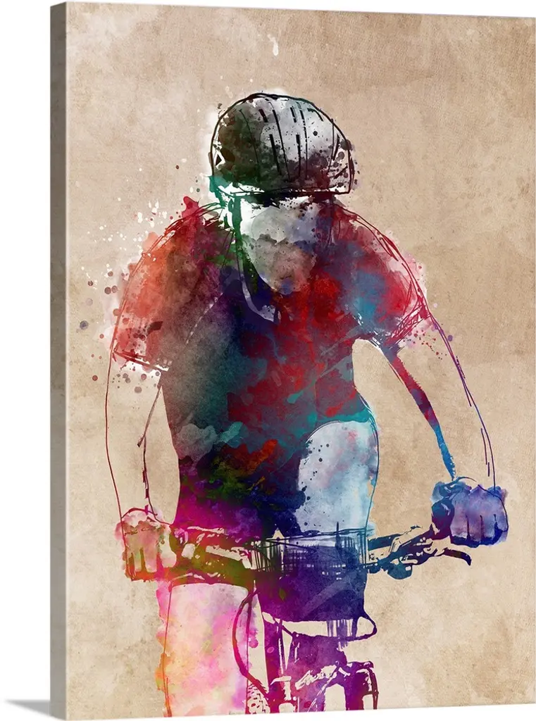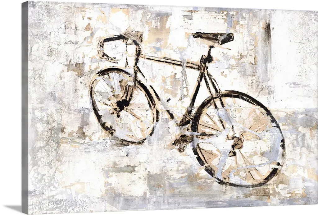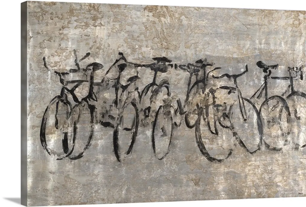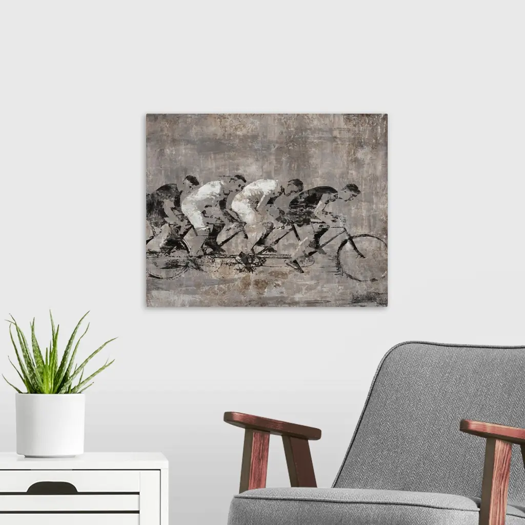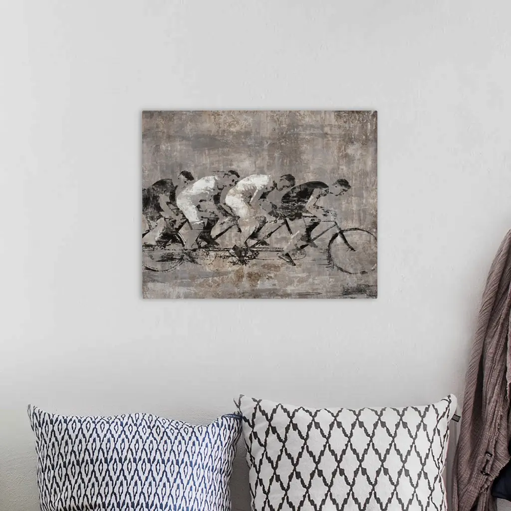 Contemporary art of four riders on a tandem bicycle, painted with patchy sponge textures and neutral tones that create a vintage feel.