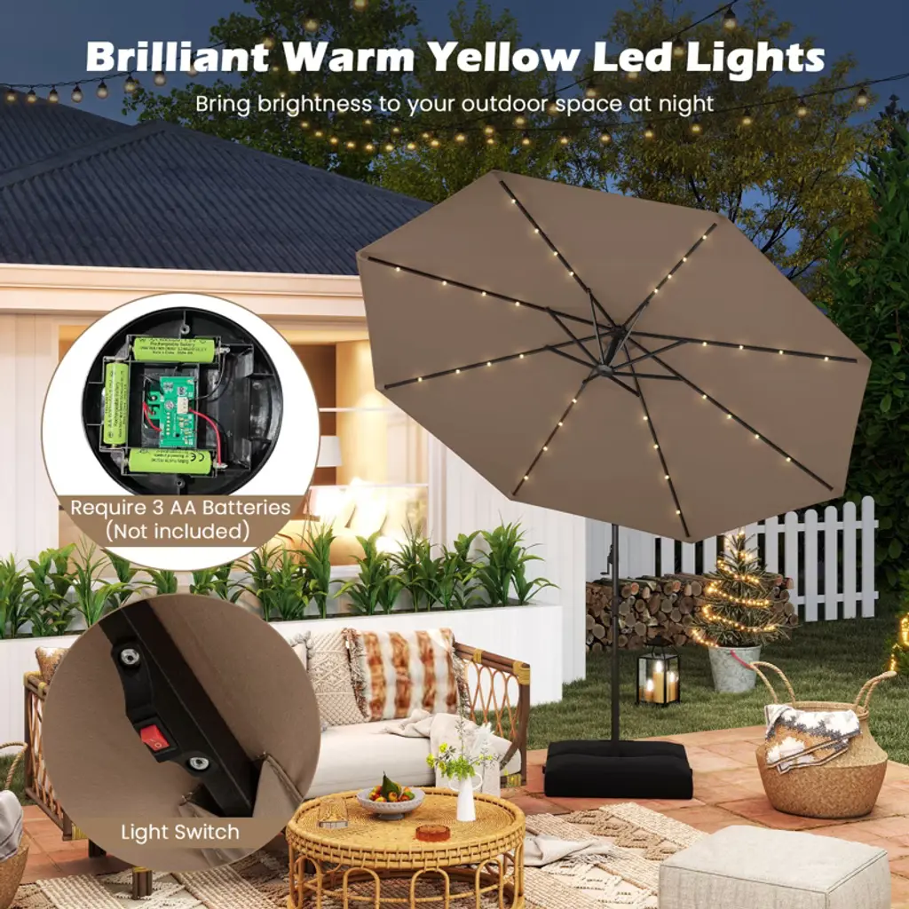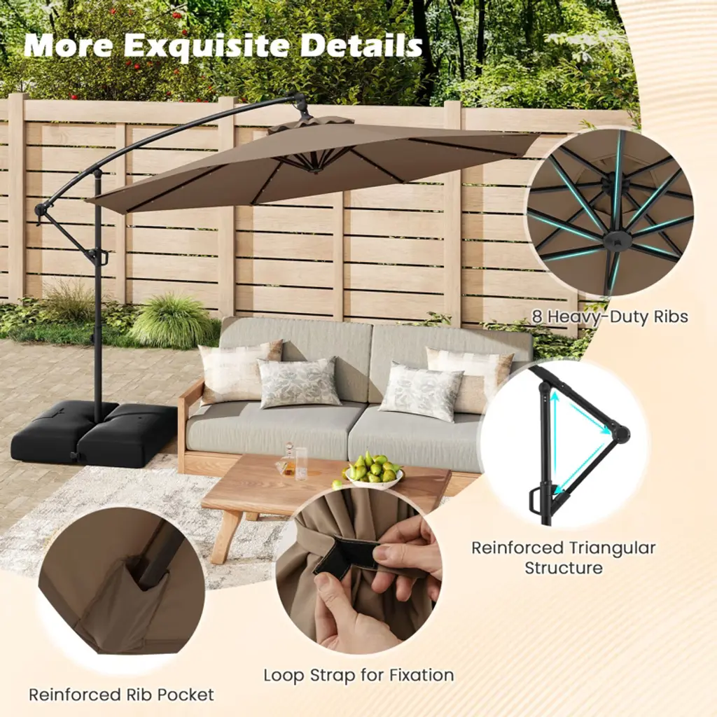 Tangkula 10 Ft Patio Offset Hanging Umbrella W/solar Led Lights Tilt & 360° Rotation Weighted Base Vented Top Outdoor Market Parasol Taupe