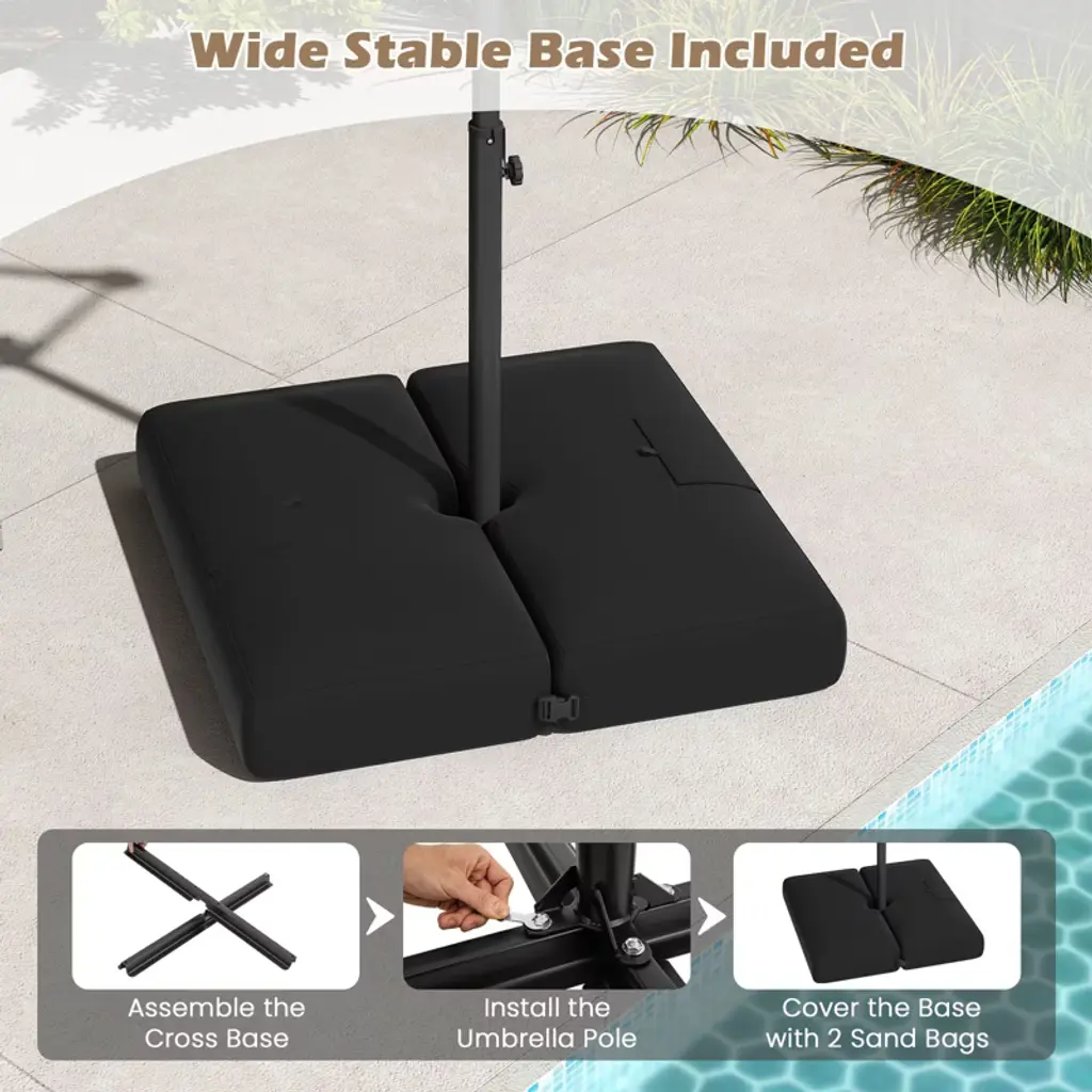 Transform Your Outdoor Space into a Cozy and Illuminated Retract! Our 10 ft offset hanging umbrella with a base is a perfect shading solution for your patios, gardens, poolside areas, outdoor events, or even commercial areas. Not only offering unparalleled shade, it could also create a charming ambiance for your evenings with the built-in LED lights, which are powered by a solar panel, providing warm and inviting illumination for 4-6 hours. Thanks to the umbrella's seamless ability to tilt and rotate 360°, customize your shade is a breeze, while the locking mechanism allows for easy operation.FeaturesIncludes a base, comes with 2 sandbags that could withstand a weight of 220 lbs The infinite tilt and 360° rotation allow you to block the sun from different directions Easy to tilt, loosen the locking mechanism and then move the handle up and downSpecifications:Color: Beige / Gray / Taupe / Turquoise / Red Material: Dyed Polyester Fabric, Metal Product Dimensions: 10 x 8.5 ft (Dia. x H) Ground Clearance: 6.4 ft Folding Size: 2.6 x 2.6 x 7.8 ft (L x W x H) Net Weight: 29.5 lbs Package Includes: 1 x Patio Offset Umbrella 1 x User's Manual