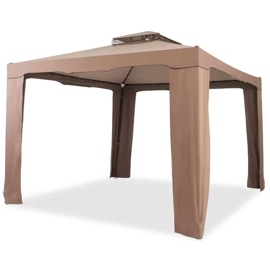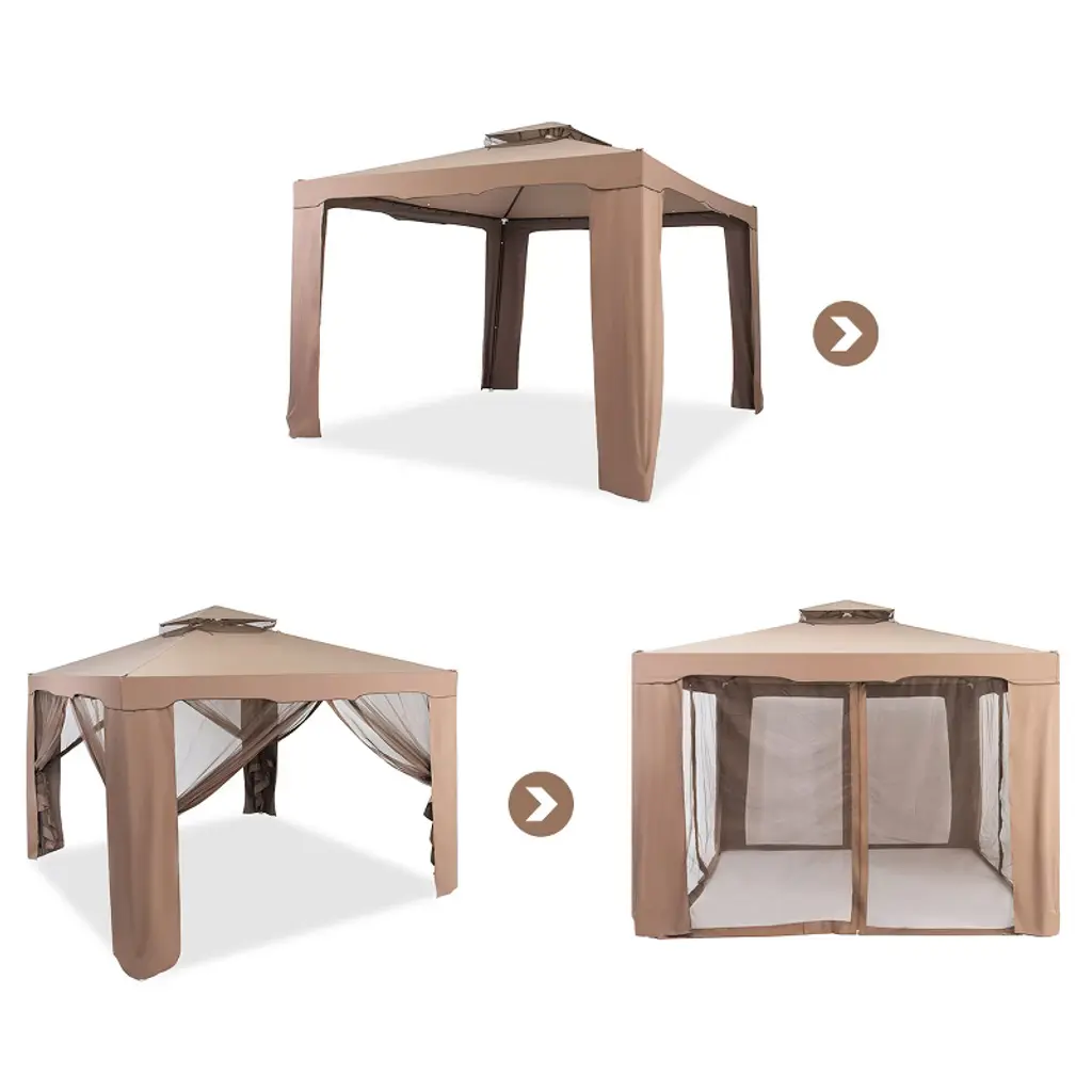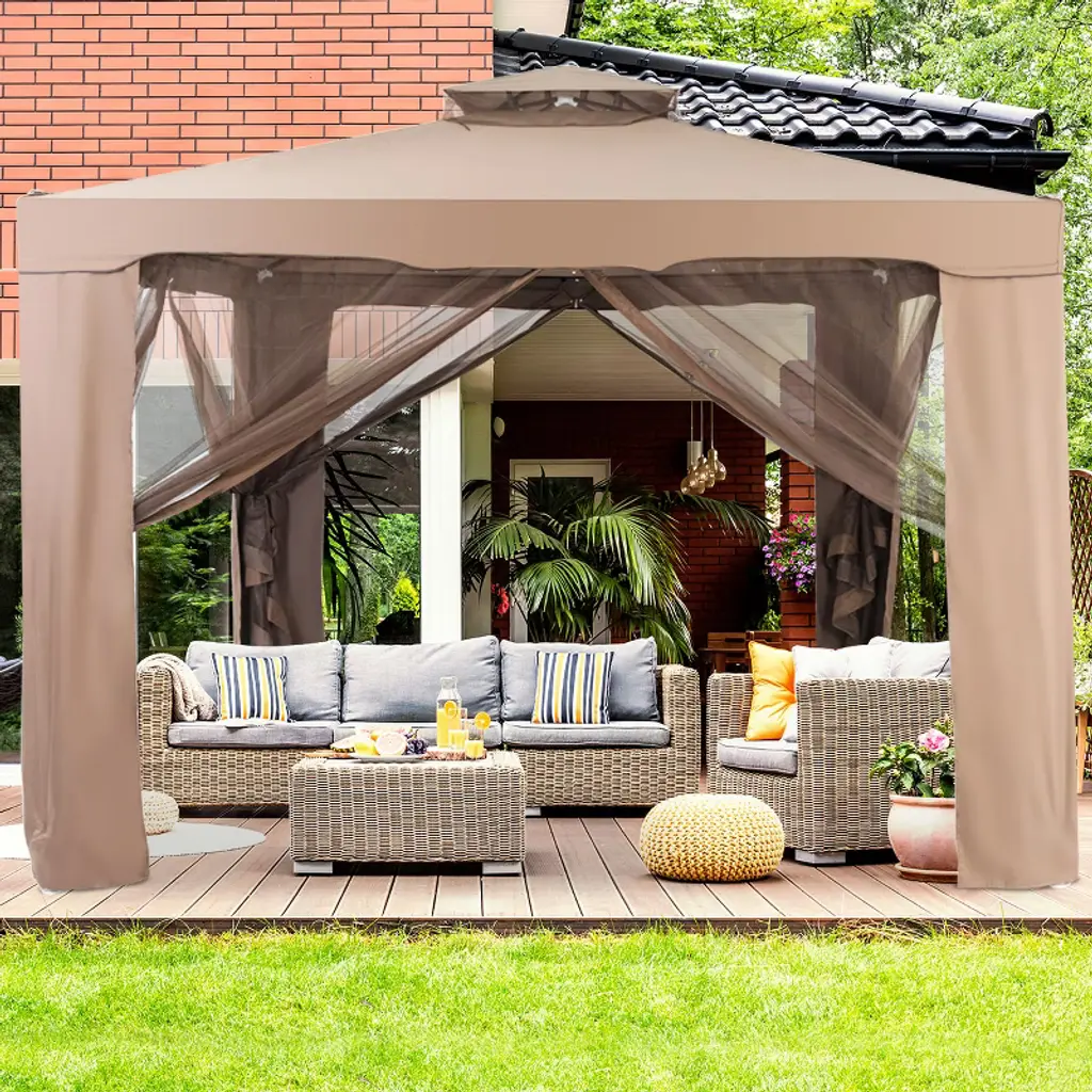 This is a premium Anti-mosquito Canopy for outdoor using. 10' x 10' footprint offers wide space for outdoor dining, gatherings. Designed with double-tier canopy gazebo and polyester fabric cover, it provides proper ventilation. Mosquito Netting screen enclosure system is designed to protect your outdoor entertainment area without the worry of pesky insects or mosquitoes. Comes with clip-on rings that should be used for installing your netting onto your gazebo's curtain rod/cable.FeaturesDouble -tier canopy top keep out the sunshine, rain and UV radiation Polyester fabric as cover, easy to clean and maintain Solid Steel pipe as structure with buckle connection, ensure great stability 8 pcs metal stakes to fix canopy to the ground, increasing the stabilityString is designed for fastening canopy leg fabric, make it easy to set upMosquito netting set keep you from disturbing of mosquito and other insectsPerfect for outdoor camping, parties, picnics and other conditions