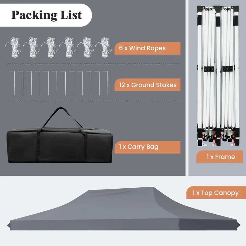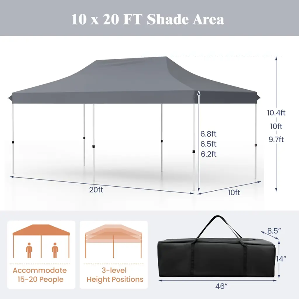 Our instant canopy tent is a perfect companion for various outdoor events! Constructed with a sturdy frame made of heavy-duty powder-coated metal, our tent ensures long-term outdoor use. The oxford fabric canopy is coated with silver, providing exceptional UPF50+ sun protection. For added stability and safety, we include 12 metal ground stakes and 6 wind ropes to firmly secure the canopy to the ground. The pop-up canopy tent is a spacious outdoor shelter with 10 x 20 ft shading area and an adjustable height of 9.7-10.4ft, which can accommodate approximately 15-20 people. And you can adapt to different occasions with 3-level adjustable heights. Thanks to the pop up design, the outdoor instant shelter can be setup with ease. To make transportation and storage hassle-free, we provide a portable carrying bag. Therefore, the portable canopy tent is a perfect choice for outdoor events and gatherings.FeaturesPowder-coated metal support frame and reinforced corners add stabilitySturdy truss connection and strong center hub provide firm support210D oxford fabric with silver coating is water-resistant and non-fading 6 wind ropes and 12 ground stakes firmly fasten the tent to ground 10 x 20ft shade area can comfortably accommodate 15-20 peoplePop-up design greatly simplifies assembly stepsEasy to adjust the 3-level height positions with adjust buttonPortable & versatile design allows for wide applicationSpecifications: Color: Blue/Black/Grey/White Material: 210D Oxford Fabric, Silver Coating, Metal Overall Dimensions: 20 x 10 x 9.7-10.4 ft (L x W x H) Carrying Bag Size:46” x 8.5” x 14” (L x W x H) Adjustable Height: 9.7/10/10.4 ft Ground Clearance: 6.2/6.5/6.8 ft Net Weight: 60.5 lbs Package Includes: 1 x Pop-up Canopy Tent 12 x Metal Ground Stake 6 x Wind Rope 1 x User’s Manual