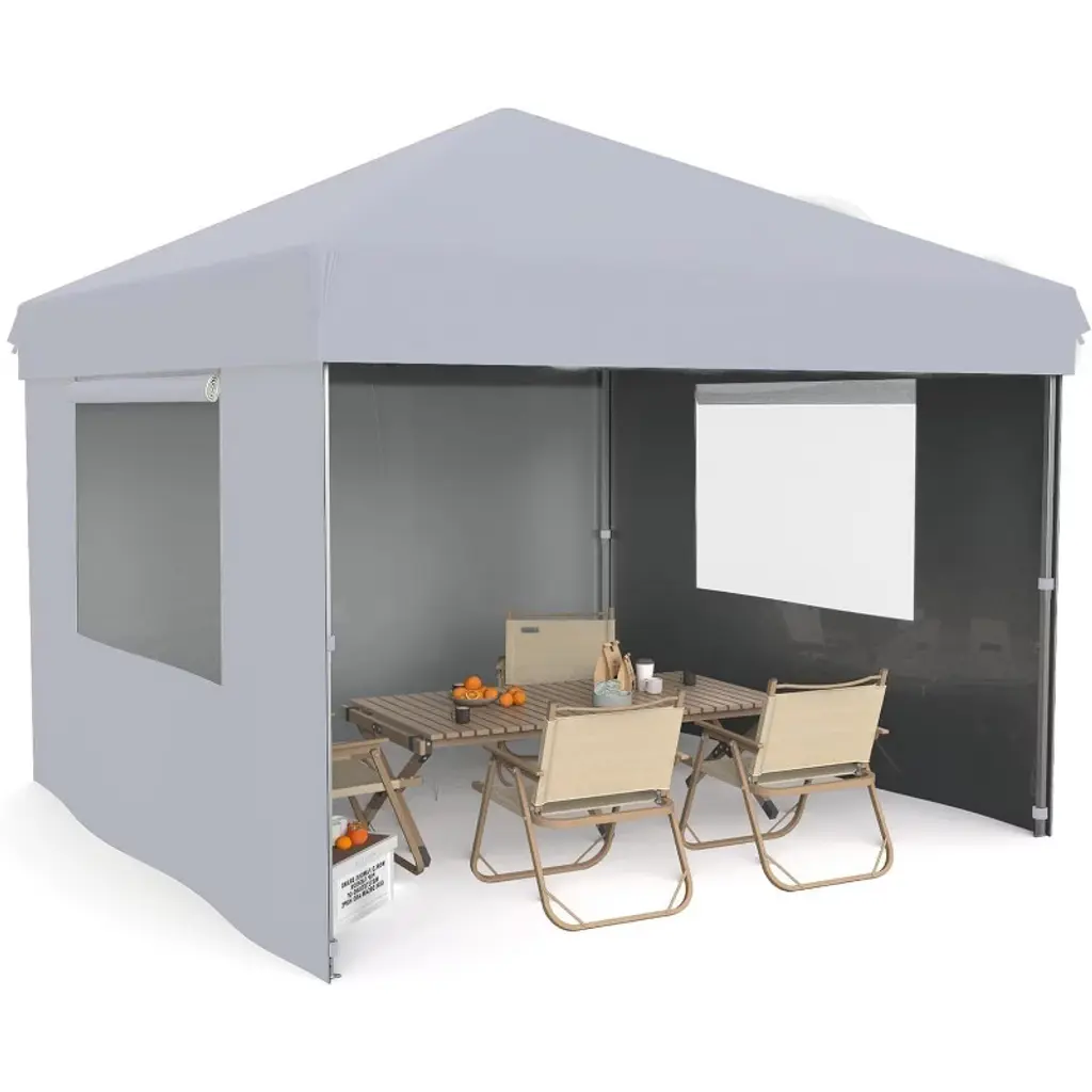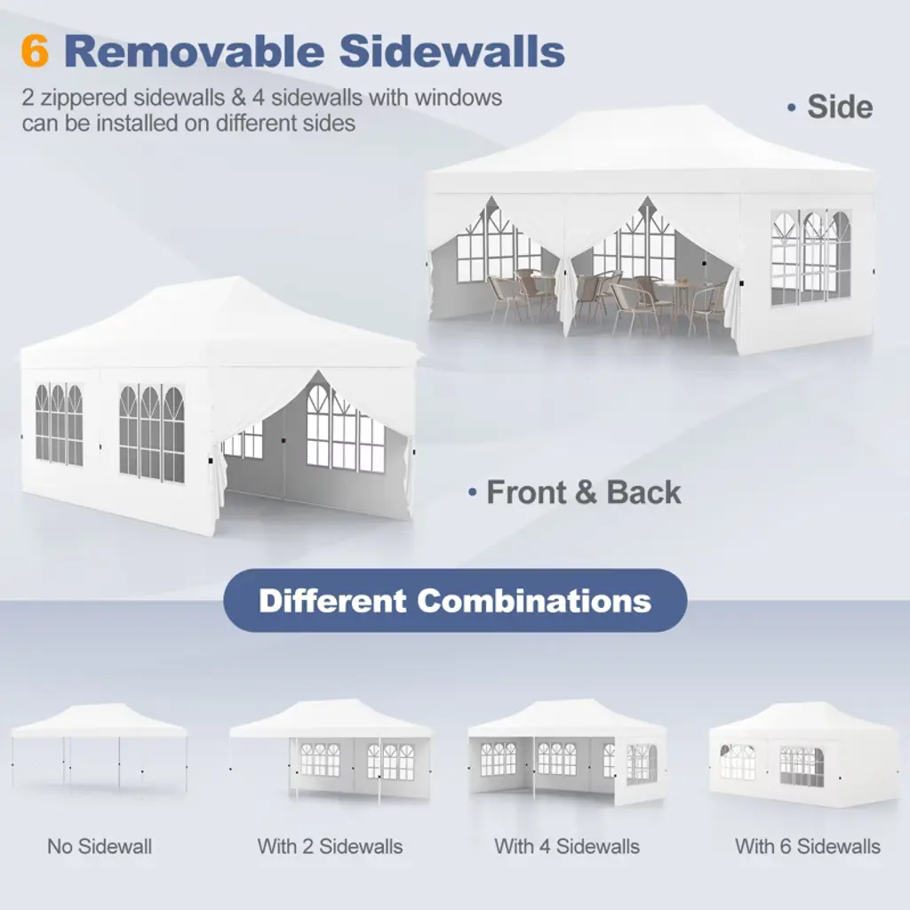 Our 10 x 20FT pop up canopy is a perfect addition to make your outdoor activities truly exceptional! With 10 x 20ft large shade area, the pop-up canopy tent provides ample space for an array of outdoor events such as picnics, parties, weddings. And there are 3 adjustable heights to meet your needs. Equipped with 6 removable sidewalls, you can choose to install with 2 sidewall, 4 sidewalls or no sidewall. And the sidewalls feature charming window to elevate its style. The 2 zippered doors can be assembled at side, or front & back as you like to provide easy access. Adopting tear-resistant oxford fabric, the upgraded material ensures lasting use in outdoors. And the silver-coated fabric is sun-proof and drizzle-resistant, allowing you to revel in the outdoor splendor without worry(Not suitable for heavy rain). As the tent is supported by heavy-duty powder-coated metal frame and double reinforced metal top, you don’t have to worry about the stability. Moreover, the included wind ropes and ground stakes will improve its wind-resistance. With pop-up design, installation and storage are effortless.Features10 x 20FT pop-up canopy can accommodate 15-20 people2 zippered sidewalls & 4 sidewalls with windows can be installed on different sidesPremium 210D oxford fabric with silver coating is water-resistant and UPF 50+6 wind ropes and 12 ground stakes help fasten the canopy to groundReinforced corner and sturdy truss plate ensure outstanding stabilityBeautiful church-style window matches with occasions like wedding and party3-level height positions will suit different people’s needsSpecifications: Color: Blue/Black/Grey/White Material: 210D Oxford Fabric, Silver Coating, Metal Overall Dimensions: 20 x 10 x 9.7-10.4 ft (L x W x H) Carrying Bag Size:46” x 8.5” x 14” (L x W x H) Adjustable Height: 9.7/10/10.4 ft Ground Clearance: 6.2/6.5/6.8 ft Net Weight: 67 lbs Package Includes: 1 x Pop-up Canopy Tent 12 x Metal Ground Stakes 6 x Wind Ropes 1 x Carry Bag 1 x User’s Manual