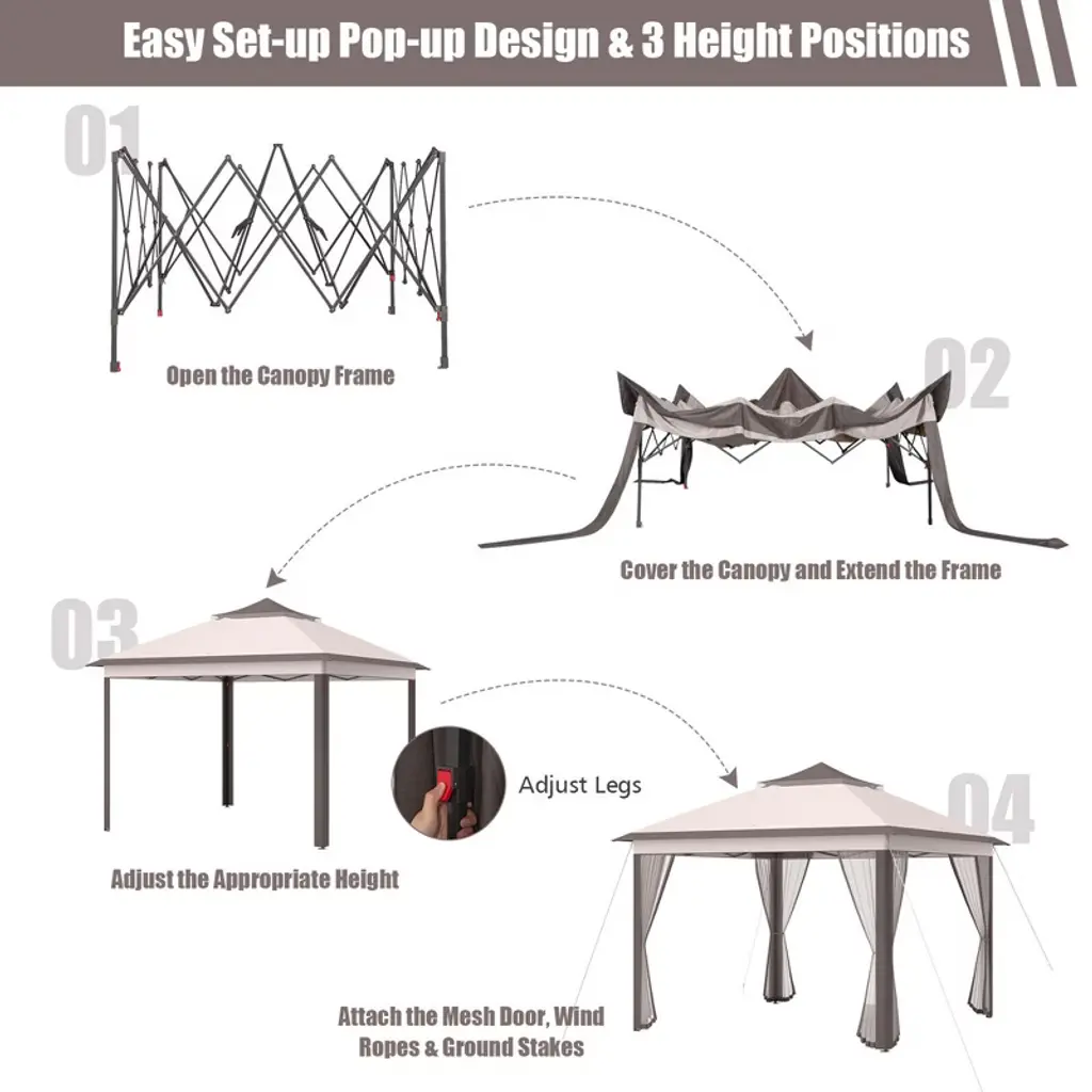 Enjoy the summer day and night with our 11' x 11' pop-up canopy tent. Featuring with 4 detachable mesh screens, our gazebo tent can maintain ventilation and keep unwanted visitors out. And the sidewalls are equipped with zippered doors for easy access. When you don't need them, you can easily store them with hook and loop fasteners. In order to allow you to enjoy the cool, we use a double ventilation roof to promote air circulation. Moreover, the height of canopy can be adjusted in 3 positions to meet your different needs. The gazebo cover is made of premium PA coated 180 g polyester fabric, which is waterproof and fade resistant to support a long time. With a carrying bag, it is easy for you to take the canopy to the beach, tailgate, park and other places.FeaturesEquipped with a carrying bag for easy transportation 3-height adjustable legs to meet different needs Easy to set up with pop-up design and clear instructionsSpecifications:Color: Beige / Brown Material: Polyester Fabric, Steel Pipe Overall Dimension: 11'x 11' x 9.5' (W x D x H) Carry Bag Dimension: 45.5" x 8.5" x 8" (W x D x H) Net Weight: 35 lbs Package includes: 1 x Patio Gazebo 1 x Carry Bag 4 x Wind Ropes 8 x Stakes 1 x Instruction