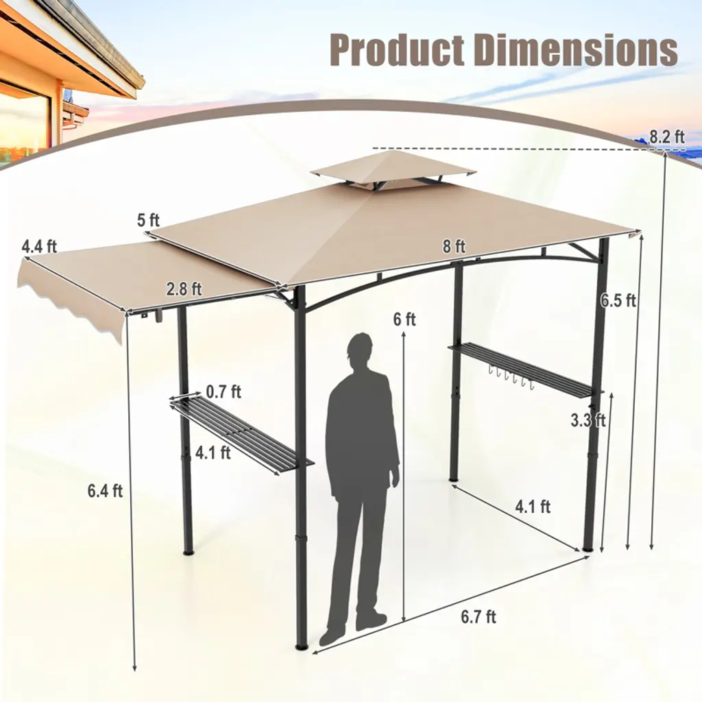 Turn Your Outdoor Grilling Sessions into a Luxurious Affair! Our grill gazebo with side awning measures 11 x 5 x 8.2 ft (L x W x H), offering ample shading space for enjoying BBQ or outdoor dining in your yard, pool area, garden, or deck. The awning supported by hydraulic rods is easy to open and close. And there are bar counters with 2 shelves and several hooks, offering extra storage space for your grilling essentials. Other than that, it boasts sun-protective and flame-resistant polyester canopy and rustproof metal frame, which is built to withstand various weather conditions, ensuring long-term outdoor use. And there is a double-tiered top and stake-fixed plates, making the gazebo more stable.FeaturesComes with a side awning, offer extra shade coverage and protection The side awning is controlled by hydraulic rods, provide stable support The double roof design promotes airflow and increases stabilitySpecifications:Color: Beige / Brown Material: Polyester Fabric, Metal Overall Dimensions: 11 x 5 x 8.2 ft (L x W x H) Gazebo Size: 8 x 5 x 8.2 ft (L x W x H) Awning Size: 2.8 x 4.4 x 6.4 ft (L x W x H) Ground Clearance: 6.5 ft Side Metal Shelf Size: 4.1 x 0.7 ft (L x W) Net Weight: 44.5 lbs Package Includes: 1 x Grilling Gazebo 1 x User's Manual