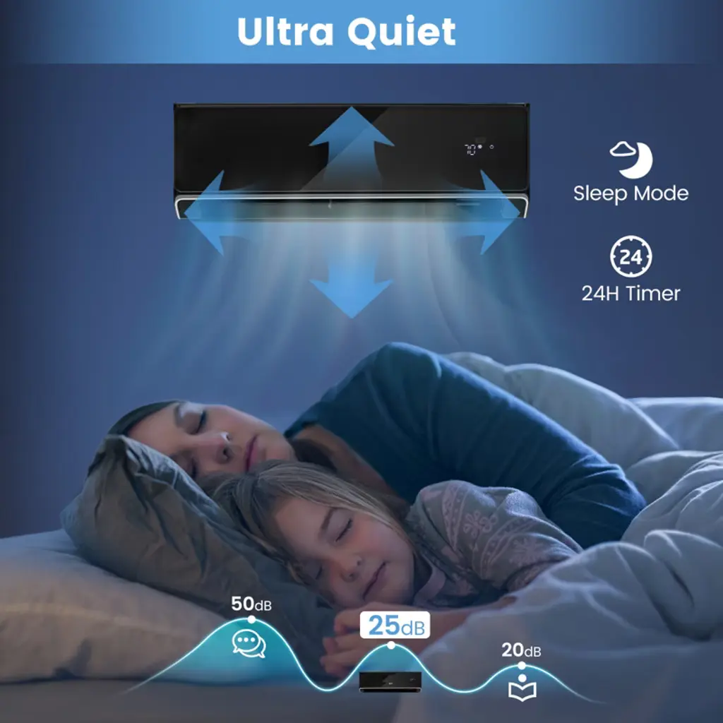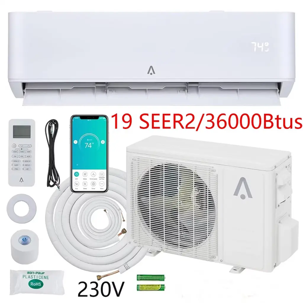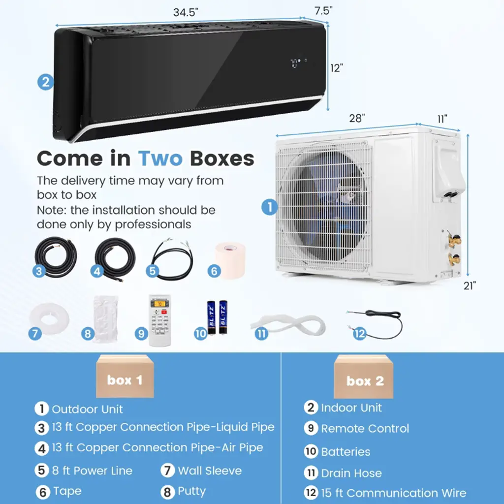 Enjoy coolness and comfort with our Wifi enabled split air conditioner! This split AC unit can cool, heat, fan, or dry rooms up to 750 Sq. Ft. With the help of smart App and remote control, it cools down to 60℉/16℃ and heats up to 90℉/32℃. The air conditioner supports Alexa or Google assistant. It features 22 SEER2, 9 HSPF2, ECO mode, inverter technology to ensure less energy cost and stable cooling or heating. 25 dB low noise and 0-24H timer allow you to enjoy peaceful sleep. Moreover, the high temperature self-cleaning function makes it easier to clean the air conditioner. The filter can also be removed for effortless cleaning.FeaturesStrong cooler for 12000 BTU cooling capacity 1 ton heat pump for 12300 BTU heating capacity 4-in-1 air conditioner to cool, heat, fan, or drySpecifications:Color of Indoor Unit: White Color of Outdoor Unit: Black Material: Metal, Aluminum, Plastic Indoor Unit Size:34.5" x 7.5" x 12"(L x W x H) Outdoor Unit Size: 28" x 11" x 21"(L x W x H) Cooling Capacity: 12000 BTU Heating Capacity: 12300 BTU Voltage: 208-230V~60Hz/1PH Max. Input Power: 1600W Max. Input Current: 10A Coverage Area: 750 sq. ft Air Flow Rate: 353 CFM Temperature Setting Range: 60℉~90℉ Refrigeration: R32 SEER: 22 HSPF: 9 Indoor Noise Level: 25 dB Outdoor Noise Level: 50 dB Total Net Weight:78 lbs Package Includes: 1 x Indoor Unit 1 x Outdoor Unit 1 x 13 ft Copper Connection Pipe - Liquid Pipe 1 x 13 ft Copper Connection Pipe - Air Pipe 1 x 8 ft Power Line 1 x 15 ft Communication Wire 1 x 6.5 ft Drain Hose 1 x Remote Control with 2 Batteries 1 x Tape 1 x Wall Sleeve 1 x Putty 1 x User Guide