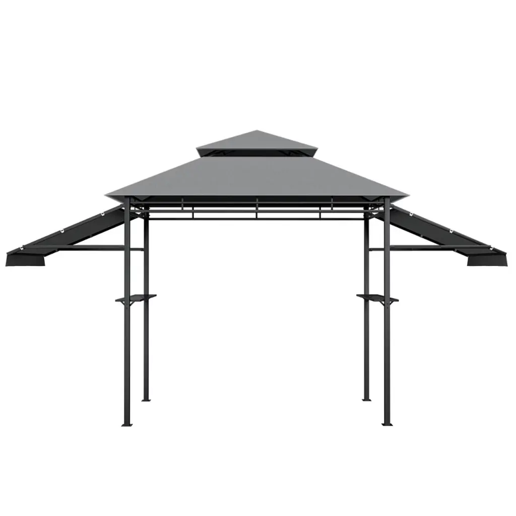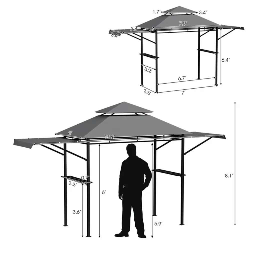 Our Grill Gazebo Would Give You a More Comfortable BBQ Experience at Home! The 13.5 x 4 ft gazebo with 7 x 3.5 ft footprints provides a large space to accommodate grills and expand the outdoor cooking space,which is the ideal choice for outdoor BBQ,picnics,and parties. Specifically,this grill gazebo comes with 2 side awnings,which can be easily adjusted in different positions,providing extra shade for enjoying delicious food. Moreover,it adopts a double-tiered soft-top canopy for good ventilation,and some of the fumes can also be released from the top. Besides,the canopy is made of fire-retardant fabric for safer use.FeaturesWith extra extensions on 2 sides,provide more outdoor entertainment space The side awning can be opened or closed easily,and can also be adjusted at different angles The 2-tier ventilated canopy helps spread out smoke easily when grillingSpecifications:Color: Grey Material: Polyester Fabric,Steel Overall Dimensions: 13 .5' x 4' x 8.1' (W x D x H) Size of the Side Awning: 3.4' x 3.4' (W x D) Net Weight: 46.5 lbs Package Included: 1 x Grill Gazebo 8 x Ground Stake 1 x User's Manual