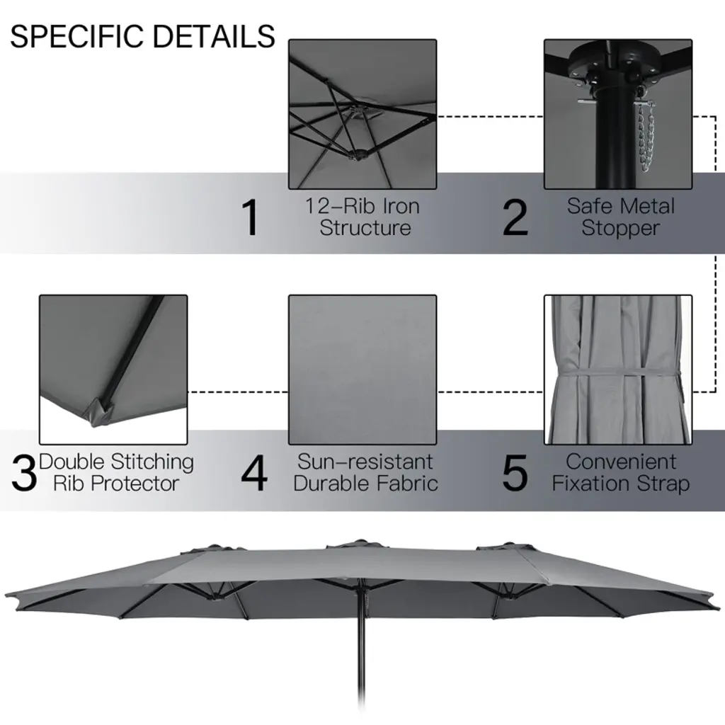 This is one of our double-sided patio parasol that provides 135ft2 of shadow area for you and your family and friends to enjoy a more leisurely time. This umbrella is suitable for use in backyards, outdoor markets and the seaside. The design of the hand rocker makes it more convenient to open and close the umbrella, and the umbrella has a long rope, so that the umbrella is not afraid to loosen after folding. The metal base at the bottom is stable enough to hold the umbrella in place and is easy to install in a few steps. The ventilation design of the umbrella makes the air under the umbrella better, the structure is stable, the material is high quality, so that the umbrella can be used for a longer time.FeaturesThe 15FT double-sided patio umbrella provides great shadingHand rocker design, easy to open and closeThe metal base at the bottom is easy to installAir vents are designed to facilitate air circulationAfter folding long rope binding, not easy to looseEquipped with a safety metal plug to ensure the umbrella supportPerfect for backyards, outdoor markets, and seasideSpecifications: Color: Red/Beige/Coffee/Orange/Turquoise/Grey Materials: Polyester, Iron Product Dimensions: 15 ft x 9 ft x 8ft (L x W x H) Net Weight: 37.5 lbs Package includes�� 1x Double Sided Umbrella with Base Stand 1x User��s Manual