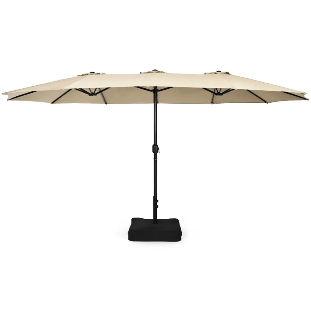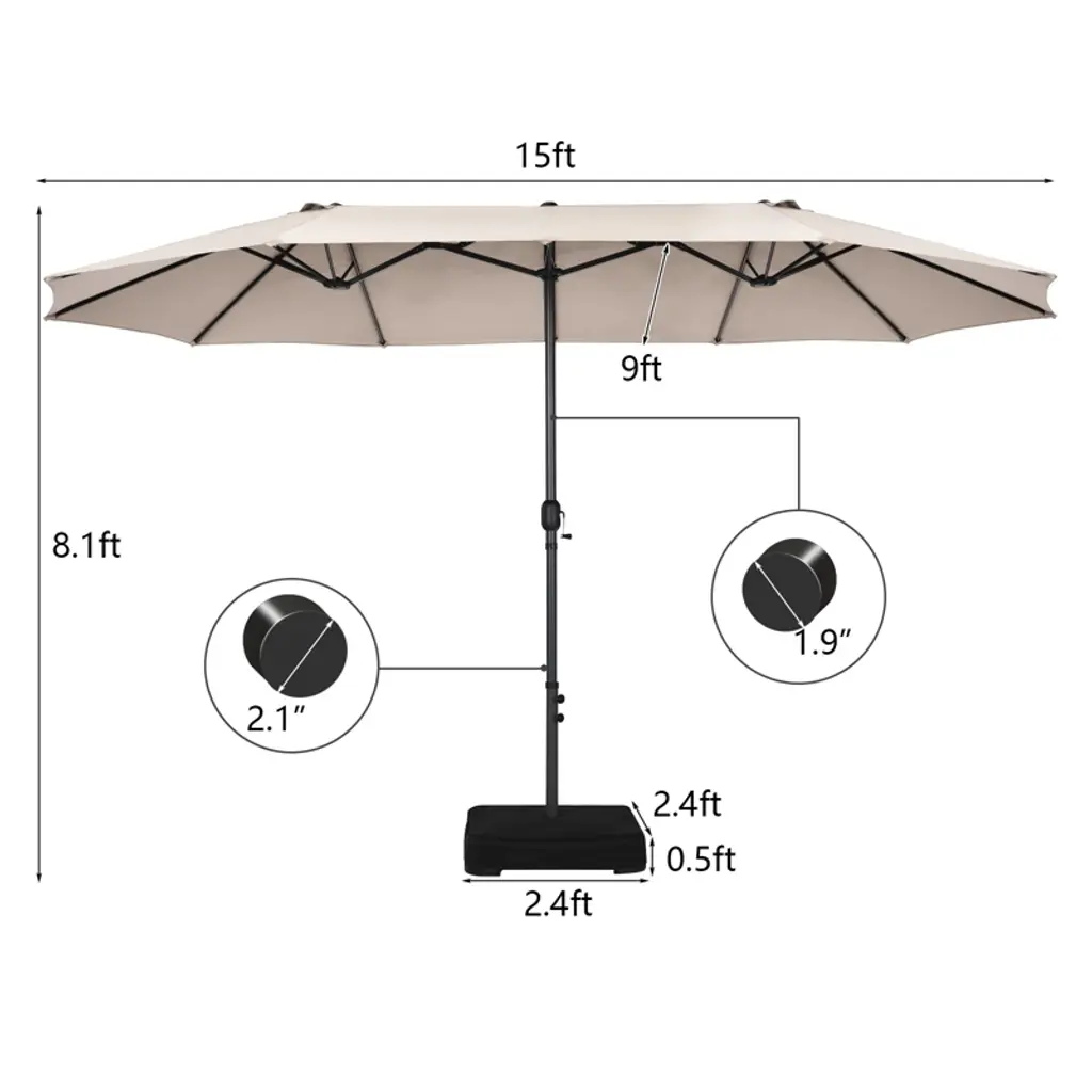 This is one of our double-sided patio parasol that provides large area of shadow area for you and your family and friends to enjoy a more leisurely time. This umbrella is suitable for use in backyards, outdoor markets and the seaside. The design of the hand rocker makes it more convenient to open and close the umbrella, and the umbrella has a long rope, so that the umbrella is not afraid to loosen after folding. The metal base at the bottom is stable enough to hold the umbrella in place and is easy to install in a few steps. The ventilation design of the umbrella makes the air under the umbrella better, the structure is stable, the material is high quality, so that the umbrella can be used for a longer time.FeaturesThe 15FT double-sided patio umbrella provides great shadingHand rocker design, easy to open and closeThe metal base at the bottom is easy to installAir vents are designed to facilitate air circulationAfter folding long rope binding, not easy to looseEquipped with a safety metal plug to ensure the umbrella supportPerfect for backyards, outdoor markets, and seasideSpecifications: Color: Beige/Coffee/Grey/Orange/Turquoise/Red Material: Steel, Polyester Fabric Overall Dimension:15 ft x 9 ft x 8.1 ft (LxWxH) Base Size: 2.4 ft x 2.4 ft x 0.5 ft Diameter of Umbrella Pole: 1.9” Net Weight: 38.5lbs Package includes: 1 x Patio Umbrella 1 x Cross Base 2 x Sandbags 1 x External Cover 1 x Instruction