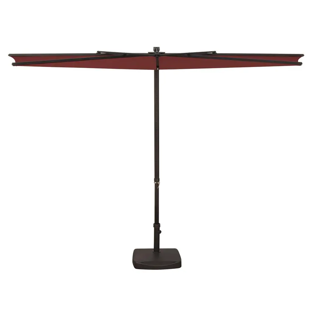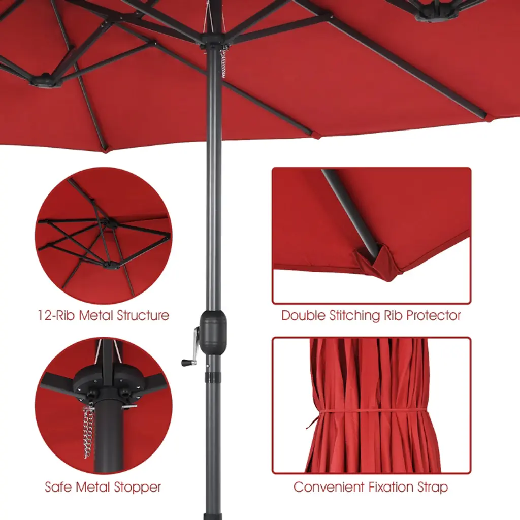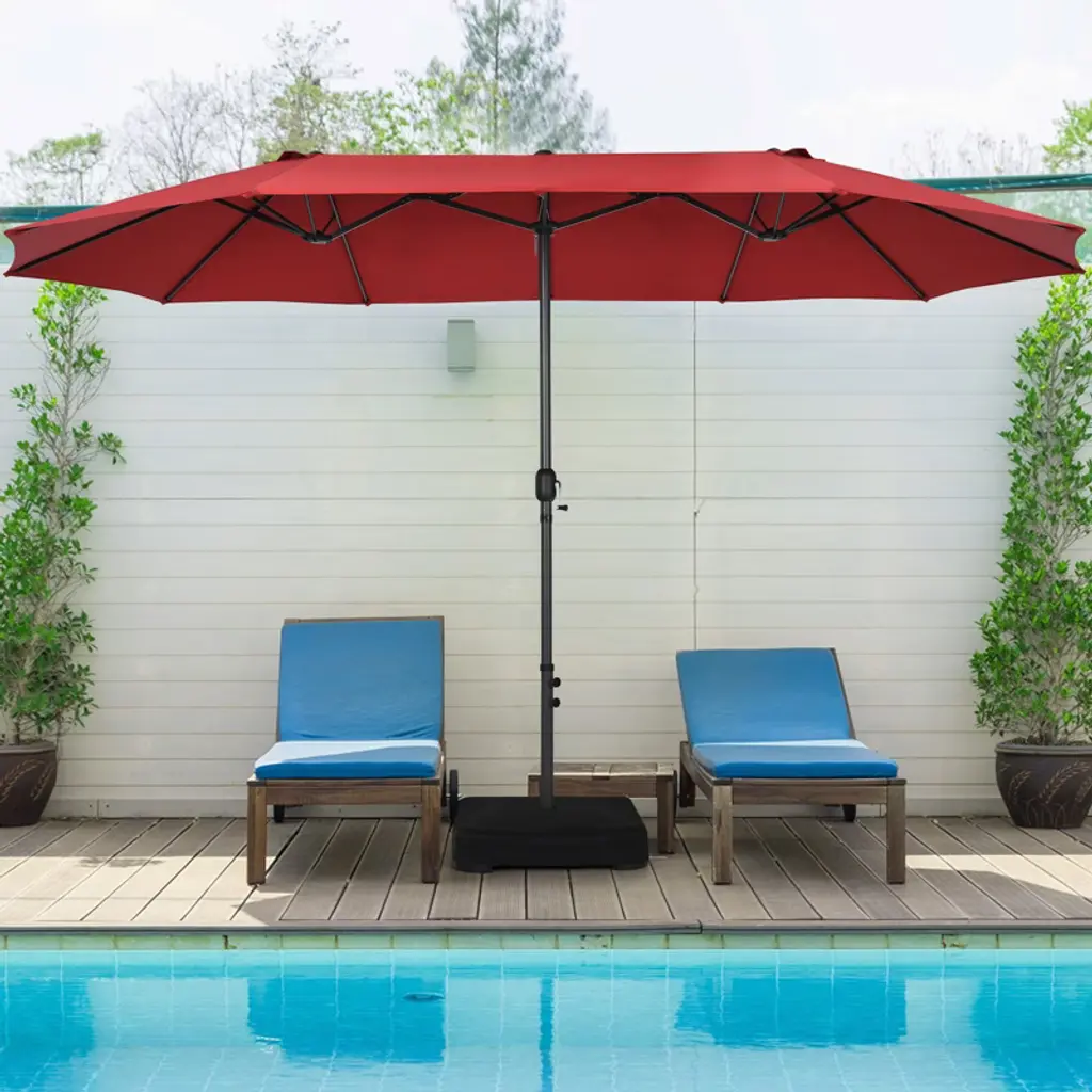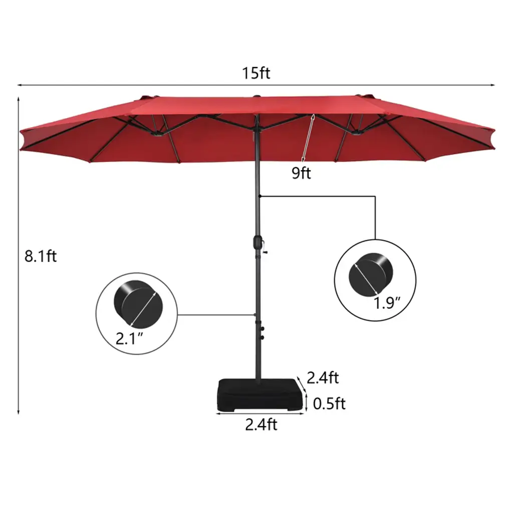 This is one of our double-sided patio parasol that provides large area of shadow area for you and your family and friends to enjoy a more leisurely time. This umbrella is suitable for use in backyards, outdoor markets and the seaside. The design of the hand rocker makes it more convenient to open and close the umbrella, and the umbrella has a long rope, so that the umbrella is not afraid to loosen after folding. The metal base at the bottom is stable enough to hold the umbrella in place and is easy to install in a few steps. The ventilation design of the umbrella makes the air under the umbrella better, the structure is stable, the material is high quality, so that the umbrella can be used for a longer time.FeaturesThe 15FT double-sided patio umbrella provides great shadingHand rocker design, easy to open and closeThe metal base at the bottom is easy to installAir vents are designed to facilitate air circulationAfter folding long rope binding, not easy to looseEquipped with a safety metal plug to ensure the umbrella supportPerfect for backyards, outdoor markets, and seasideSpecifications: Color: Beige/Coffee/Grey/Orange/Turquoise/Red Material: Steel, Polyester Fabric Overall Dimension:15 ft x 9 ft x 8.1 ft (LxWxH) Base Size: 2.4 ft x 2.4 ft x 0.5 ft Diameter of Umbrella Pole: 1.9” Net Weight: 38.5lbs Package includes: 1 x Patio Umbrella 1 x Cross Base 2 x Sandbags 1 x External Cover 1 x Instruction