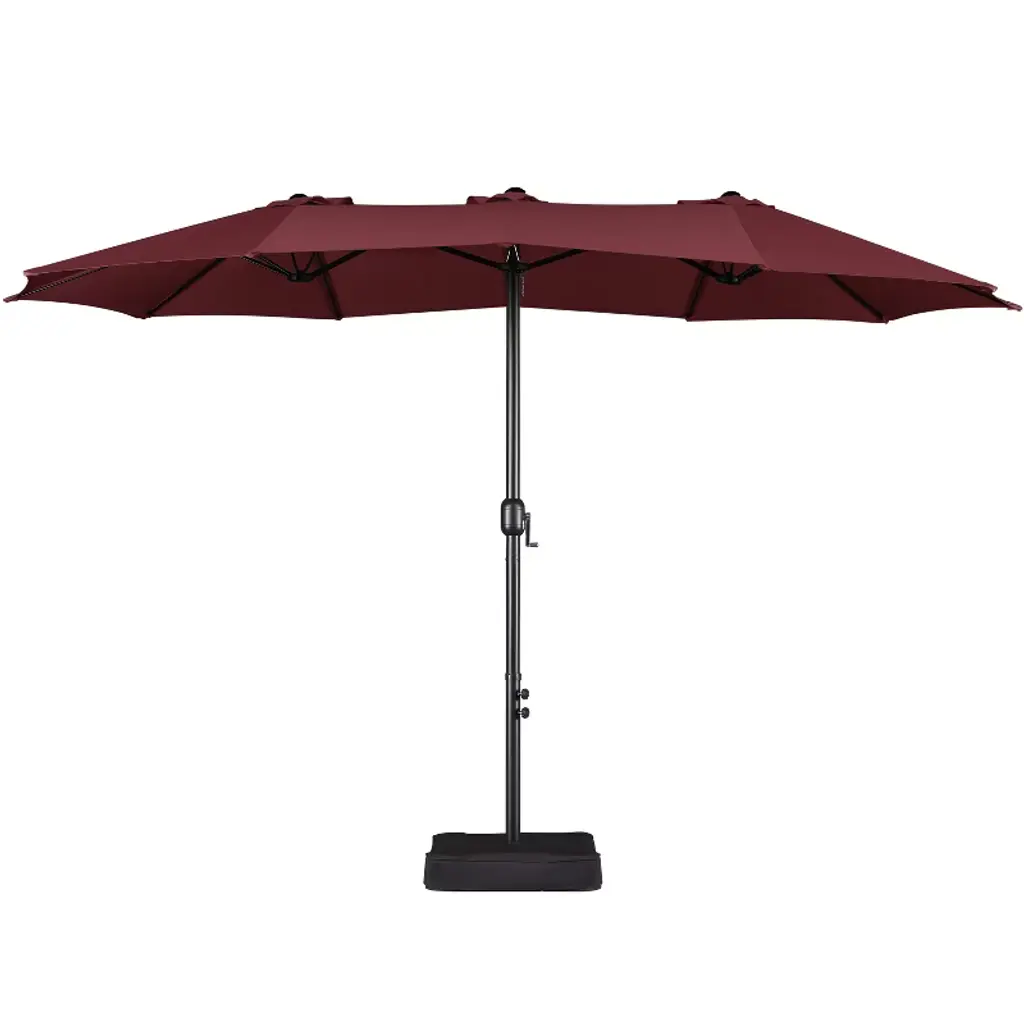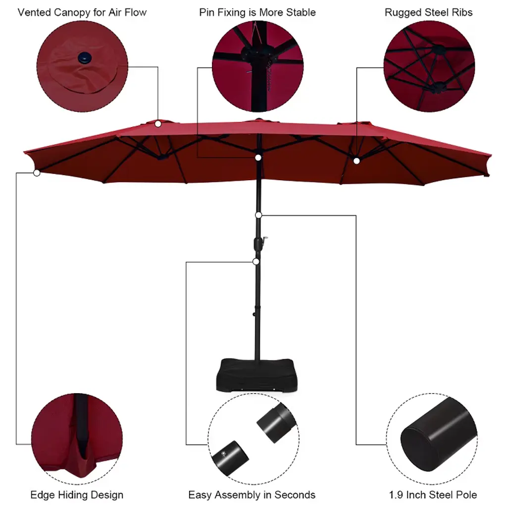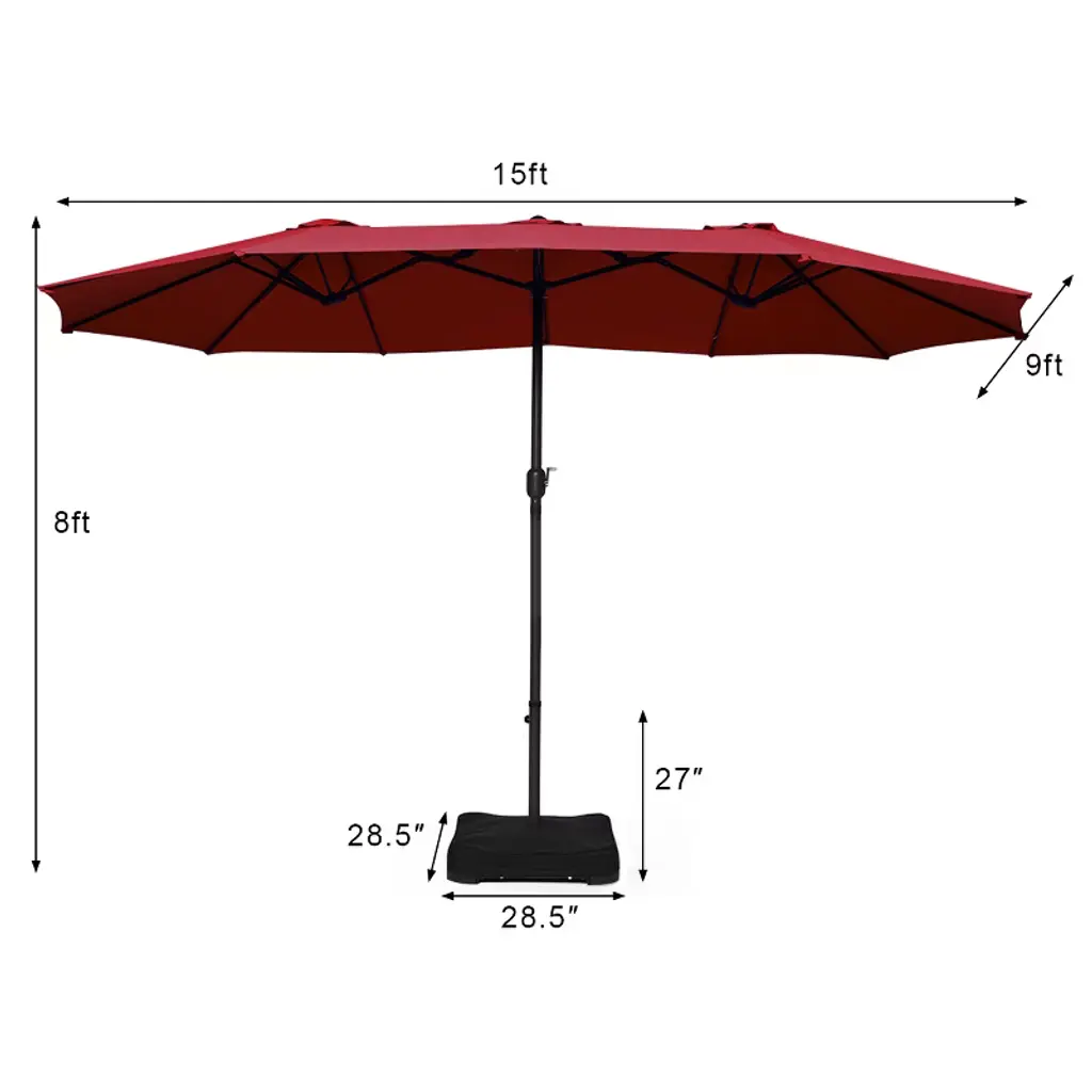 Our double-sided patio umbrella features large canopy, ensuring extra large shade. Steady construction with 12 sturdy metal ribs and one strong steel center pole make it a long using life. It also has polyester canopy that can resist water, UV light, fading and windy weather. Umbrella base with 2 sand bags and 3 wind vents help it stand stable. It will provide cool shading and bring you a good mood on the hot weather.FeaturesLarge canopy and double sided design for extra large shading 12 sturdy mater ribs and one strong steel center pole ensure its durability Polyester canopy, which is water-proof, fade-resistant, and easy to clean Base and sand bag design so that the patio umbrella can stand more stable 3 wind vents on the top for air flowing and improving it stability Easy operation with crank, help you opening and closing the umbrella conveniently and quickly Big shade protects you from harmful heat sun light and UV light Specifications Color: Tan/ Orange/ Burgundy /Beige Material: Steel + Polyester Umbrella Dimension: 15' x 8' (WxH) Base Dimension:28.5"x28.5"x29 (LxWxH) Net Weight: 38 Lbs Rib Number: 12 Air vent: Yes Package Include 1 x patio double-sided umbrella 1 x Umbrella Base 1xinstruction