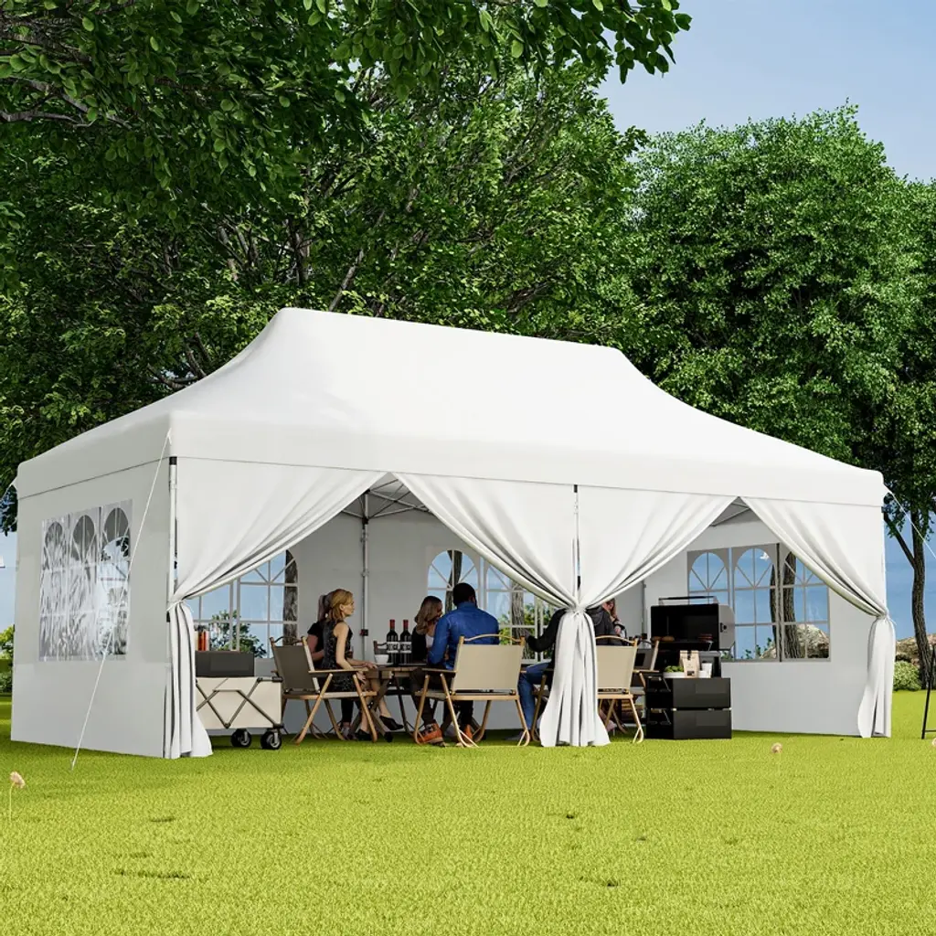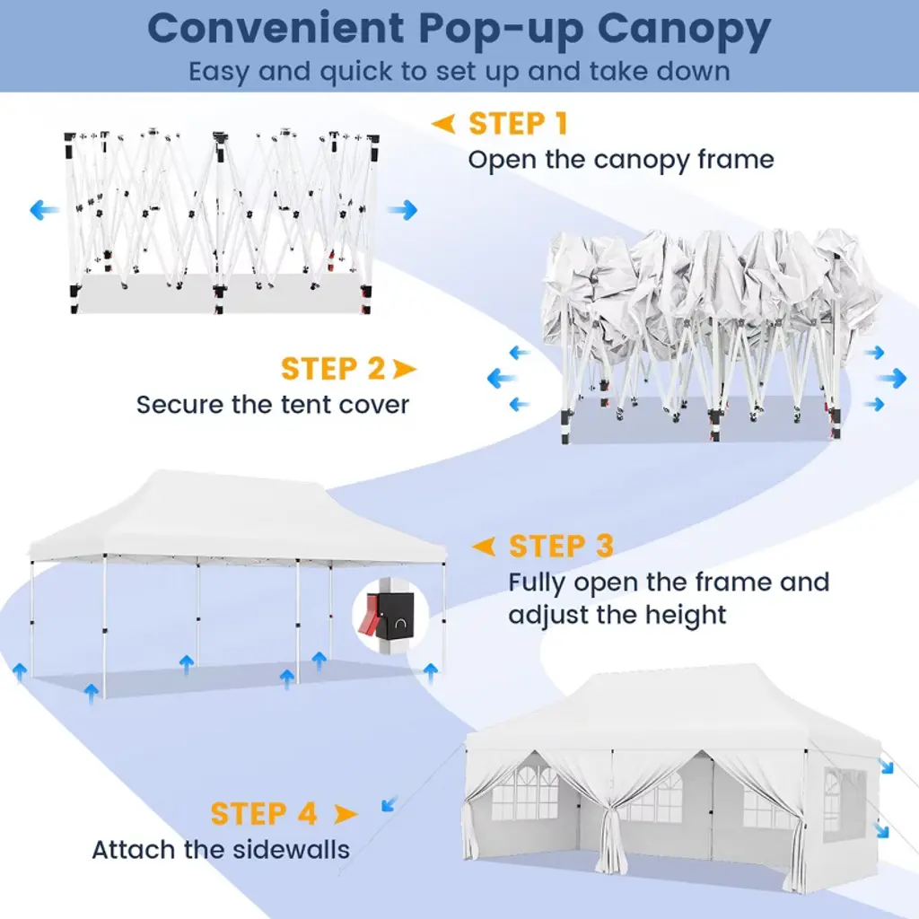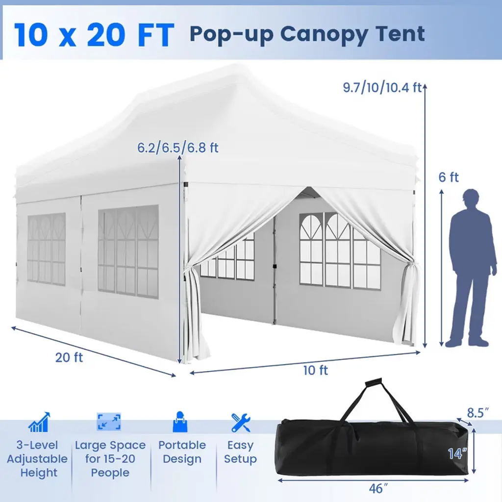 Our outdoor canopy tent measures 20 x 10 x 9.7-10.4 ft (LxWxH), providing a large outdoor shade area for enjoying picnics, BBQs, holding parties, weddings, camping, commercial use, and more. It comes with 6 detachable sidewalls and 2 of which feature zippered entrances, allowing for quick access while providing additional privacy as needed. Besides, the tent is supported by a heavy-duty powder-coated metal frame and durable oxford fabric canopy, ensuring its durability in any weather conditions. And the canopy fabric with silver coating offers excellent UPF50+ sun protection. We also provide 12 metal ground stakes and 6 wind ropes for firmly fixing the canopy on the ground, adding more stability and safety.FeaturesSupported by a heavy-duty powder-coated metal frame, rustproof, sturdy The instant pop-up design makes the installation quick and hassle-free 2 zippered sidewalls can be installed on different sides or rolled upSpecifications:Color: Blue / Black / Gray / White Material: 210D Oxford Fabric, Silver Coating, Metal Overall Dimensions: 20 x 10 x 9.7-10.4 ft (L x W x H) Carrying Bag Size: 46" x 8.5" x 14" (L x W x H) Adjustable Height: 9.7/10/10.4 ft Ground Clearance: 6.2/6.5/6.8 ft Net Weight: 67 lbs Package Includes: 1 x Pop-up Canopy Tent 12 x Metal Ground Stake 6 x Wind Rope 1 x User's Manual