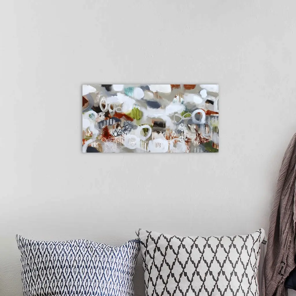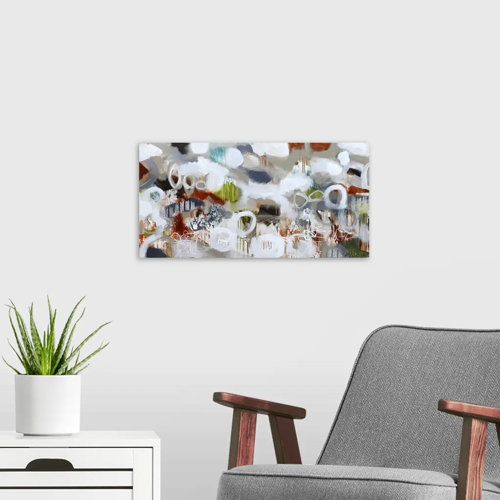 A long horziontal abstract composed of white circles overlapping varies colors of earth tone paint.