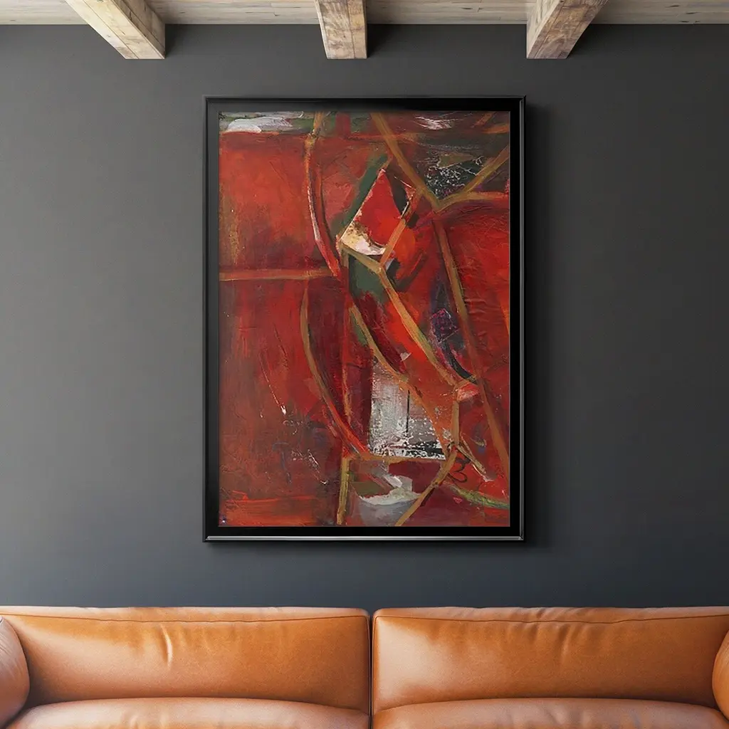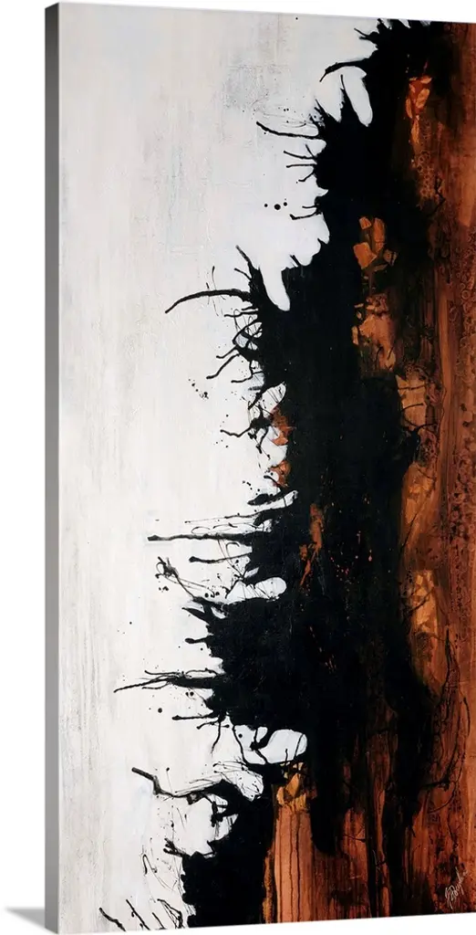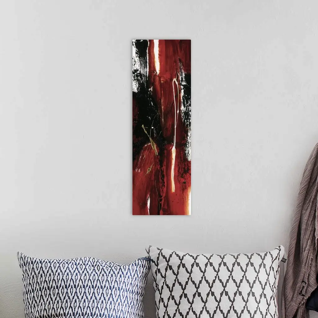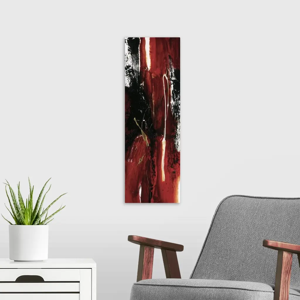 A long vertical abstract in colors of black, red and white with drips of paint and gold accents.