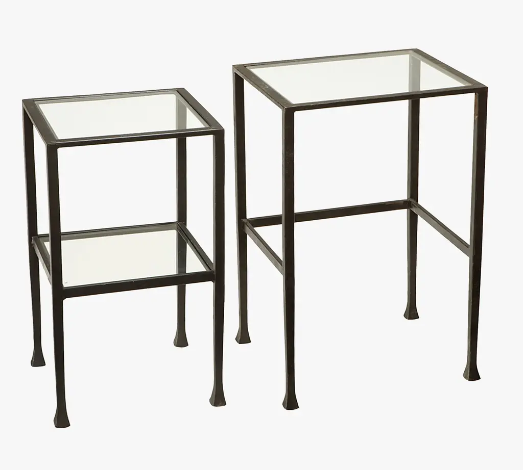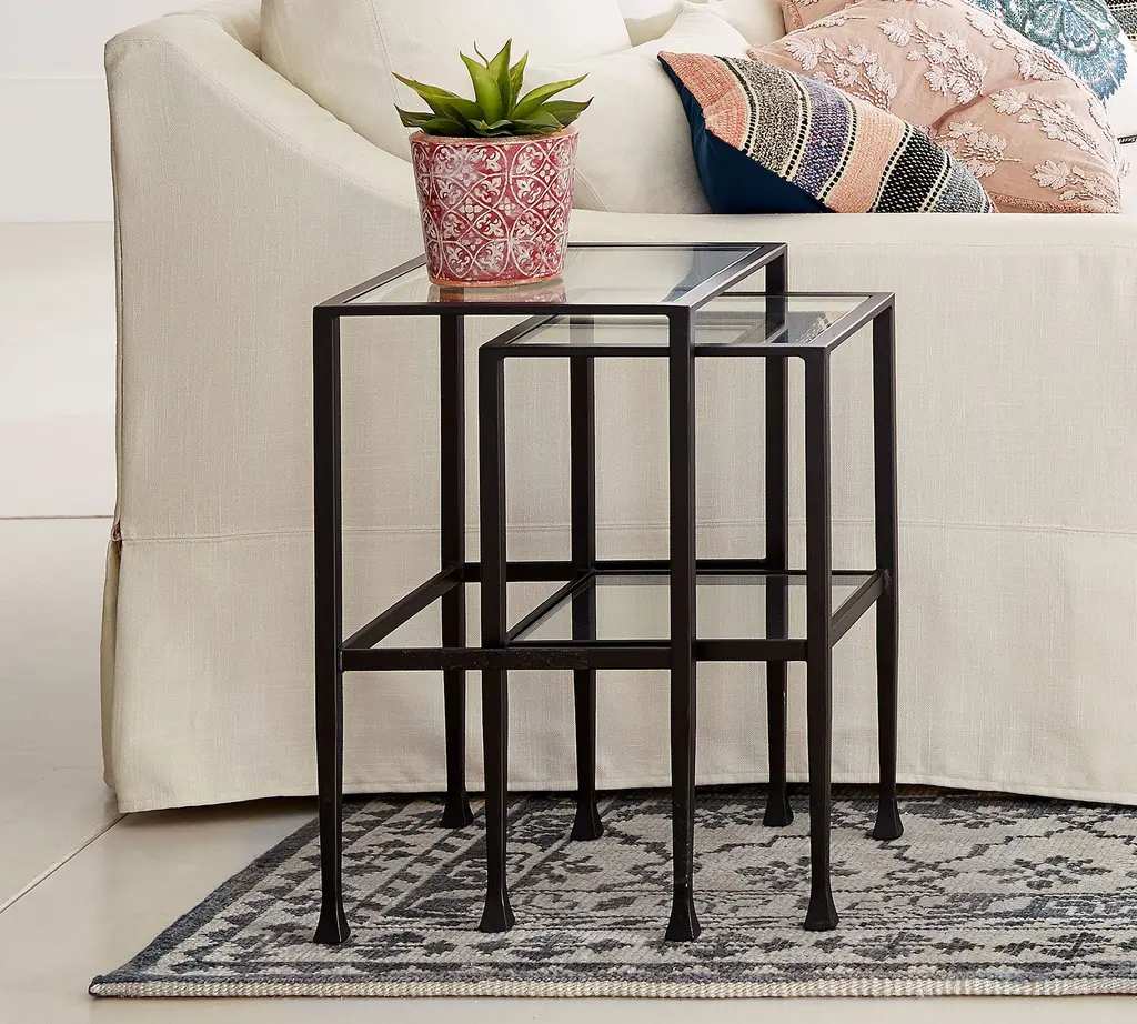 With its hand-hammered iron frames inset with tempered glass, Tanner is perfect for showcasing collectibles or displaying books. Its streamlined profile fits perfectly in small spaces, adding extra surface area while keeping the look light and airy. You can save space by nesting these tables. Make more of it by pulling them apart.
