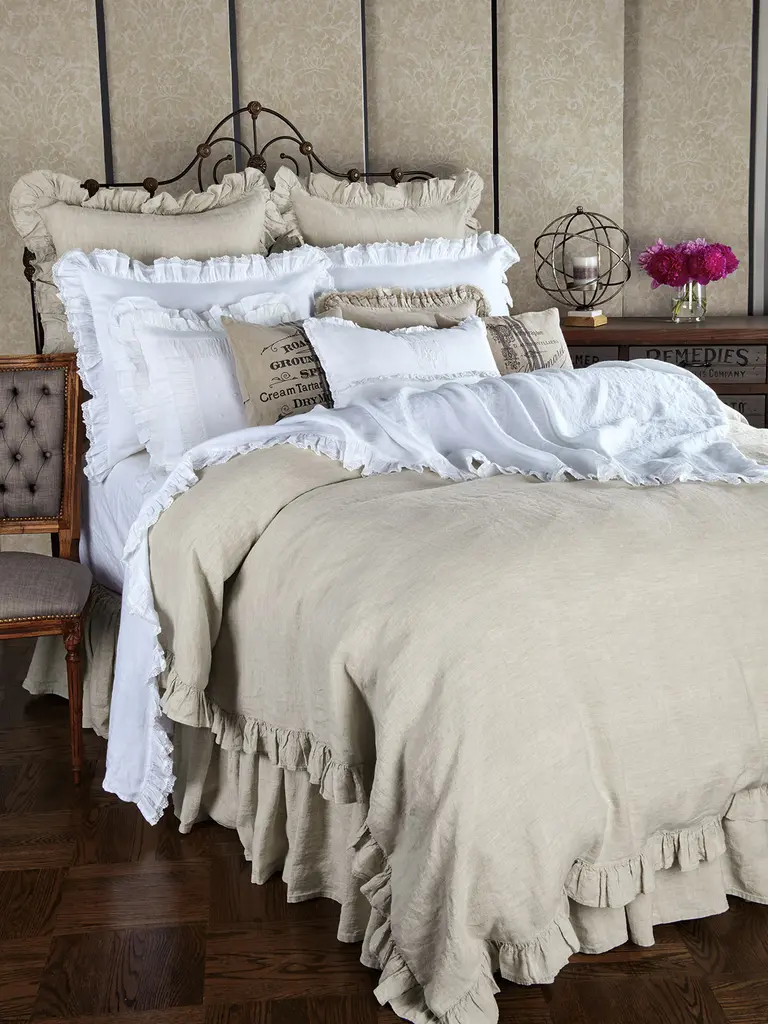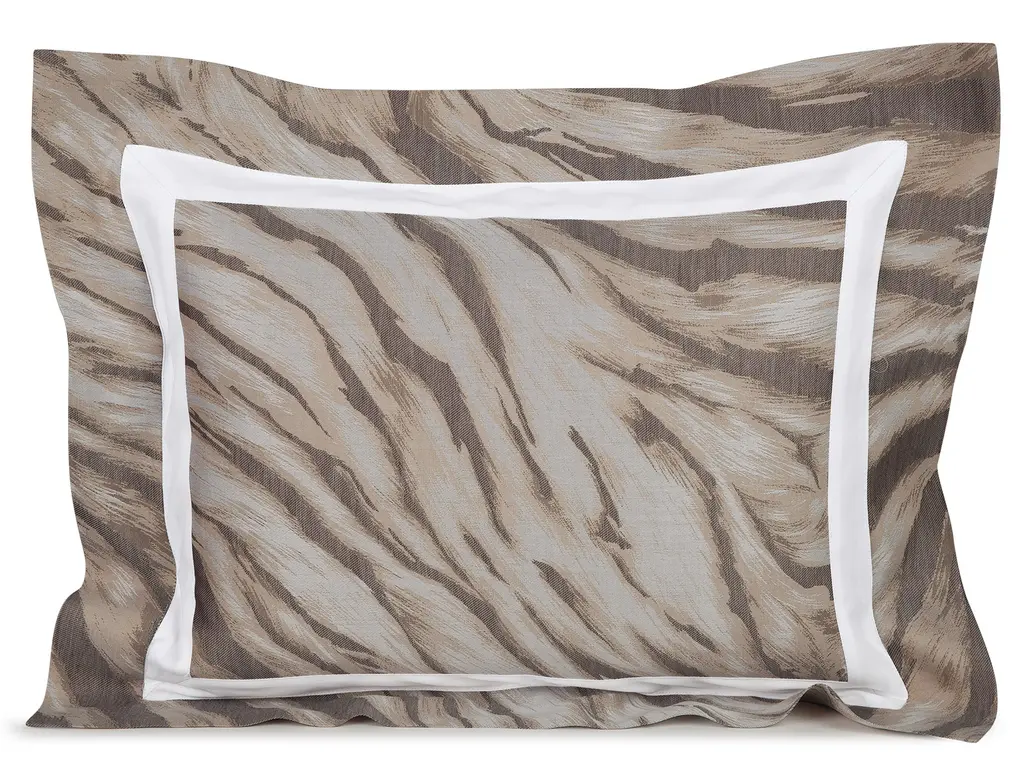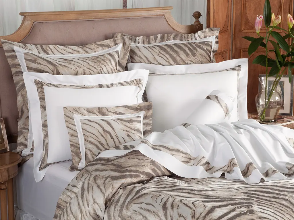 This Italian damask makes everything around you feel more elegant—and far more interesting. Exquisite neutral shading and well-defined textures command undivided attention while stunning, animalesque lines and refined ridges set the scene for sheer luxury. Duvet covers, boudoirs, and euro shams are made in the irresistible 500 thread count damask with a solid border. Flat sheets, neckrolls, king & standard shams are solid 300 thread count Egyptian cotton sateen and feature a damask insert. Together bringing a charming combination of style and pattern.