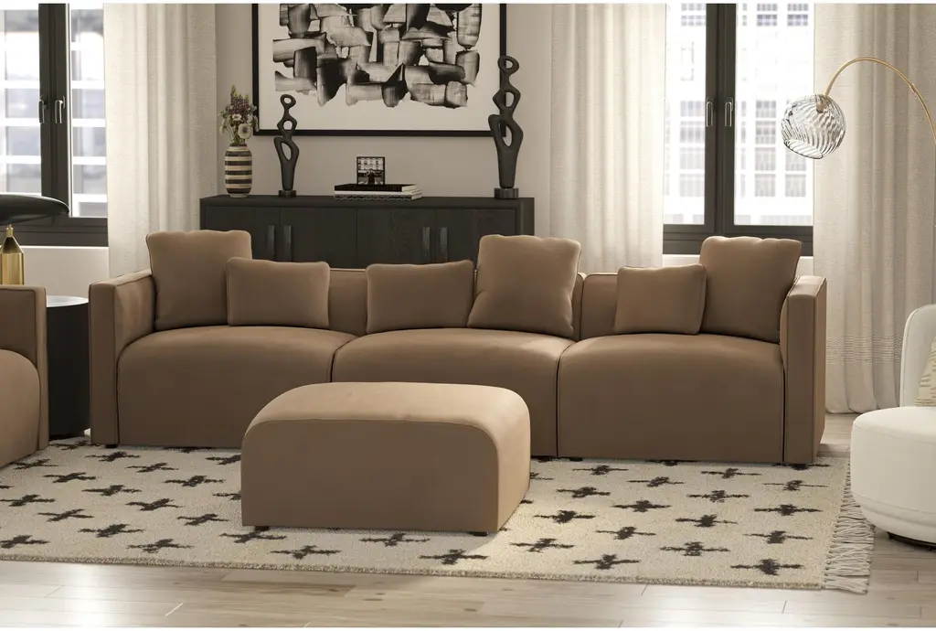 Tao Khaki Beige Velvet 119" 3 Piece Sofa Set With Ottoman creates the ultimate lounge experience with its modern modular design and luxurious upholstery. This living room furniture features hidden connectors allowing various couch configurations to fit your space perfectly, making it one of our most adaptable sofas.
