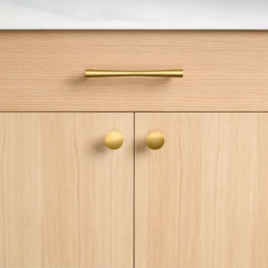 Sometimes it's the small things that pull a room together. That's why we've designed a hardware collection with modern silhouettes, clean lines and a touch of tradition to give your kitchen and bathroom cabinets that perfect finishing touch. Made of brass with a brushed finish, the stylish bar pull gently tapers into a super-subtle hourglass shape. Minimalist cylinder posts elevate the pull for a comfortable handhold. The four-inch pull is easily installed on cabinet doors and dresser drawers with included hardware.