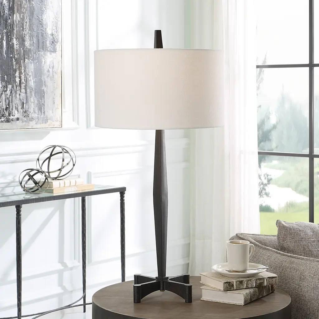 Elevate your living space with the luxurious charm of this table lamp. The lamp features a tapered base and an industrial-inspired foot finished in aged black with subtle rust distressing, adding a touch of sophistication and versatility to your decor. Bring timeless elegance to your living room with this stylish piece. Product Features: Black tapered base table lamp Lamp comes in subtle rust distressing finish Round hardback drum shade Is covered in a fabric Lamp uses (1) 150-watt E26 bulb - not included Socket type: 3-way Switch type: socket switch UL listed for indoor use only Dimensions: Overall dimension: 34.75" high Shade dimension: 10" high x 17" diameter Base dimension: 10.25" wide x 10.25" deep Material(s): metal/fabric