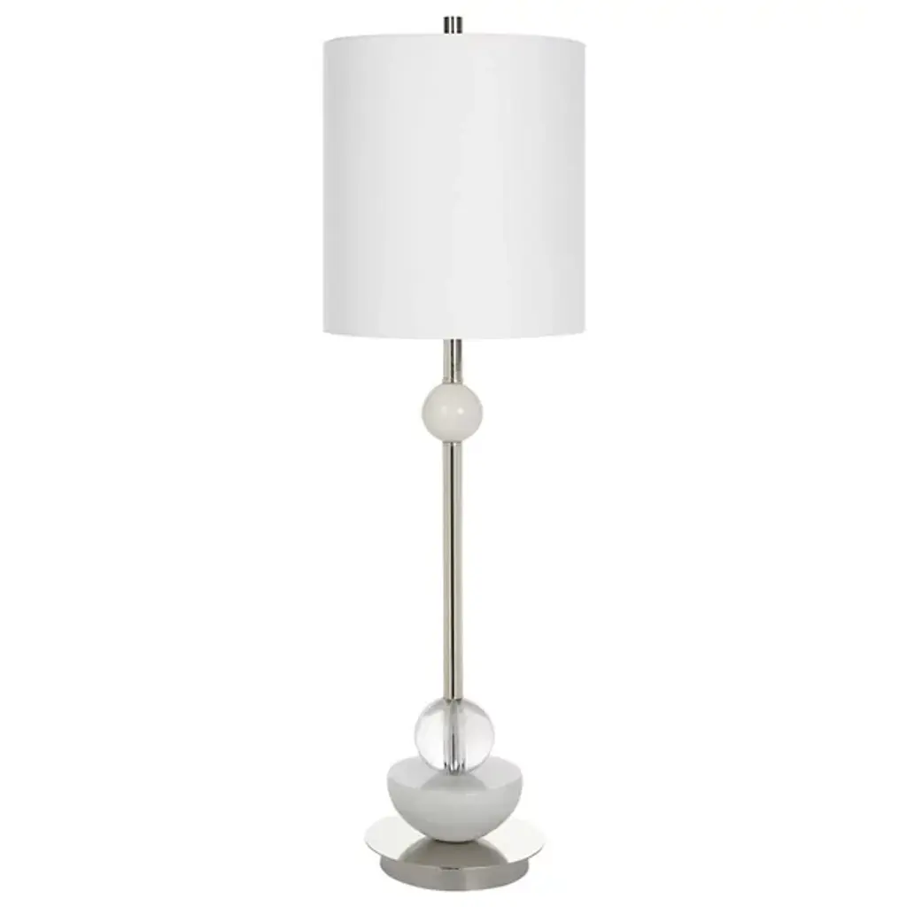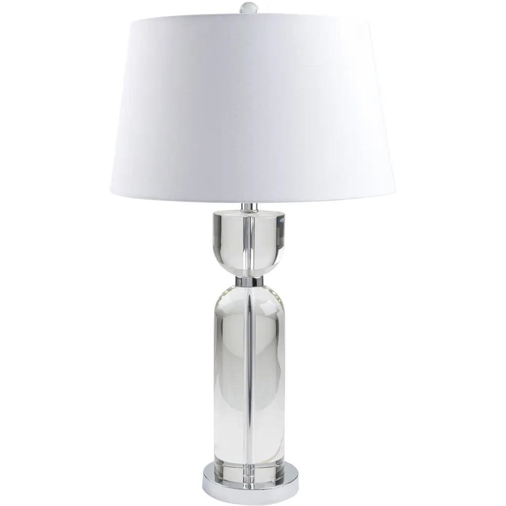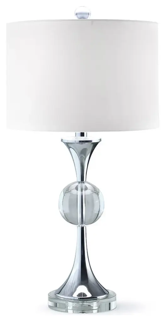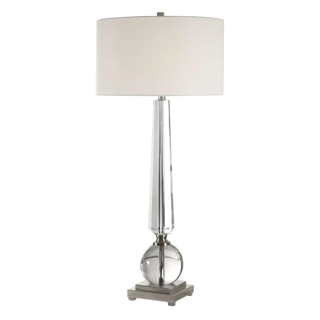 Add a touch of timeless elegance to your space with our stunning table lamp. The tapered cut crystal column, paired with a thick crystal sphere, creates a sophisticated and luxurious look. The brushed, antiqued nickel plated details add a touch of modern appeal. The round hardback drum shade completes the stylish ensemble, providing a soft and inviting glow. Product Features: Clear crystal sphere table lamp with drum shade Showcases tapered cut crystal column design Accented with brushed, antiqued nickel plated details For indoor use only .Additional Features: Wattage: 150W Bulb type: E26 Socket type: 3 way Switch type: socket switch Dimensions: Lamp height; 38.5" high Shade dimensions: 10" high x 17" diameter Crystal dimensions: 6" diameter Base dimensions: 6.75" wide x 6.75" deep Material(s): crystal/linen/crystal