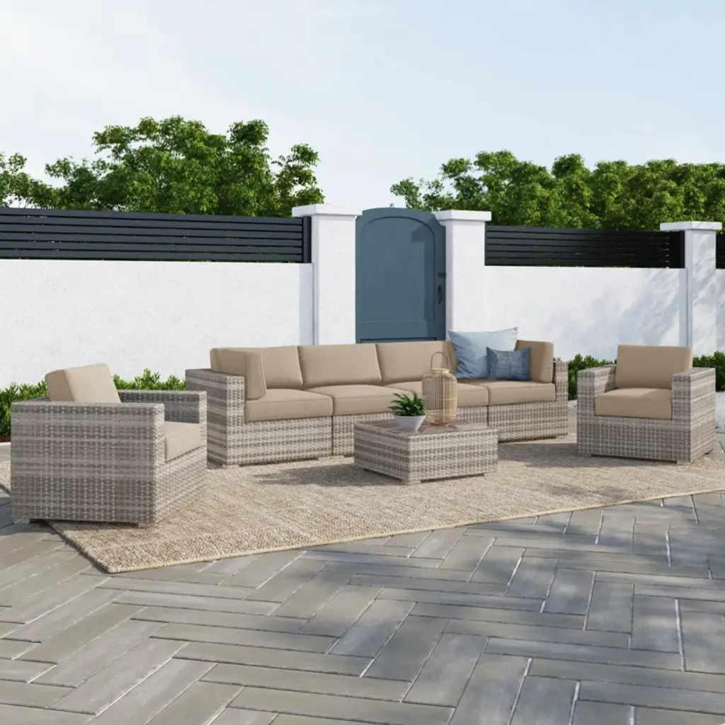 This 7-piece outdoor sectional set lets you add your own personal a la carte oasis to your porch, patio, or garden. With space for 6 people, this set includes 2 armchairs, a 4-piece sofa, and a glass-topped coffee table. Each piece is made from weather-resistant wicker with a breezy, weathered gray finish. The rust-proof aluminum frame means you can use this outdoor furniture all year long, while the deep seating and 5" thick cushions mean they're cozy as well as stylish. Best of all, this set arrives fully assembled.
