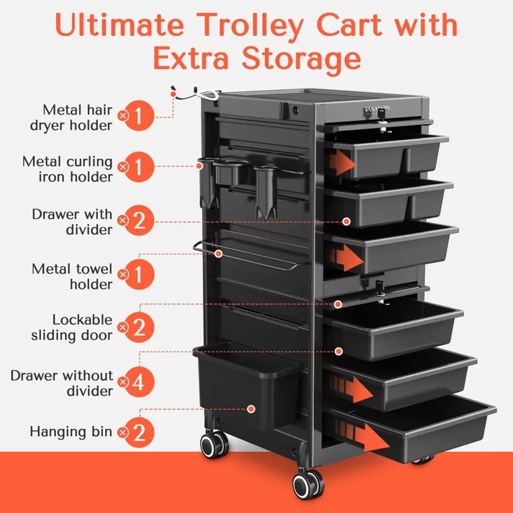 Are you tired of struggling with cluttered workspaces and messy tools? Keep all your salon tools well organized on the multi-functional trolley cart! The upgraded cart organizer comes with 360° rolling casters and detachable storage drawers, designed to revolutionize your workspace. Whether you're a professional stylist or just want to keep your grooming essentials organized, our stylish utility cart has covered all your needs. Say goodbye to chaos and make all things tidy and efficient – place your order now and experience the difference!