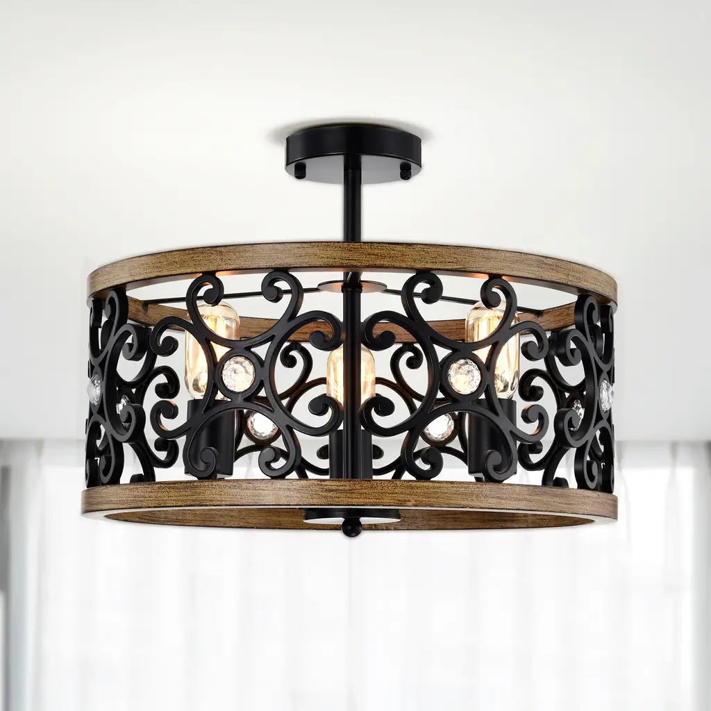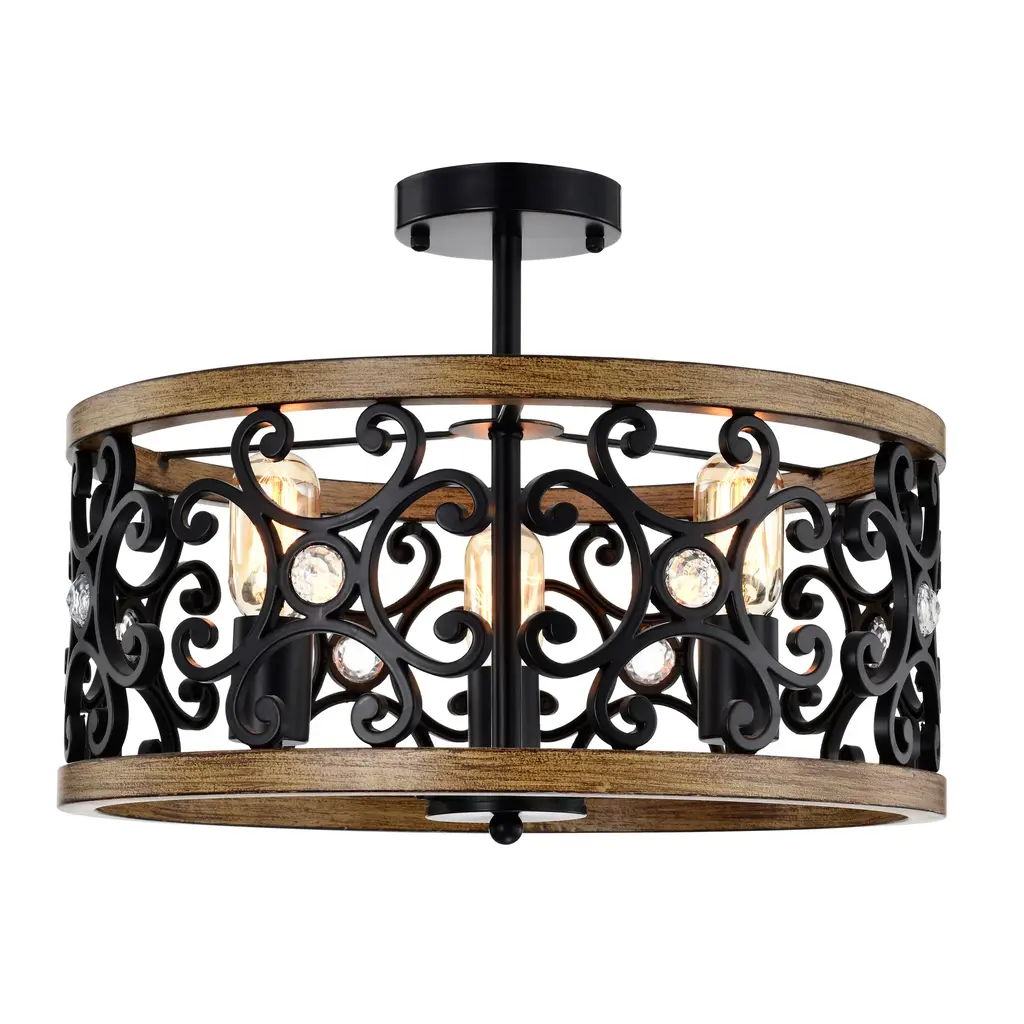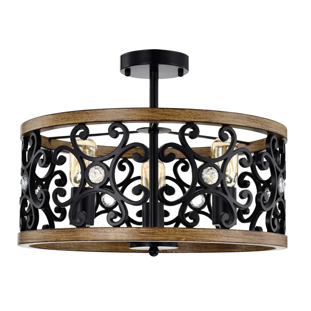 This matte black imitation wood grain Semi Flush Mount Ceiling Light is the perfect blend of classic exquisiteness and modern boldness. The drum-shaped with crystal fixture has a outer shade that adds a delightful dimensional aspect and livens up your ceiling.Features:Dimensions:Note:This light is not damp rated. Whether it is dimmable or not depends on the light bulb not on the light fixture itself. If you use dimmable light bulb and a dimmer switch, it will be dimmable. This fixture does need to be hard wired. Assembly is required. Professional installation is recommended. This light cannot be installed on a sloped or vaulted ceiling.
