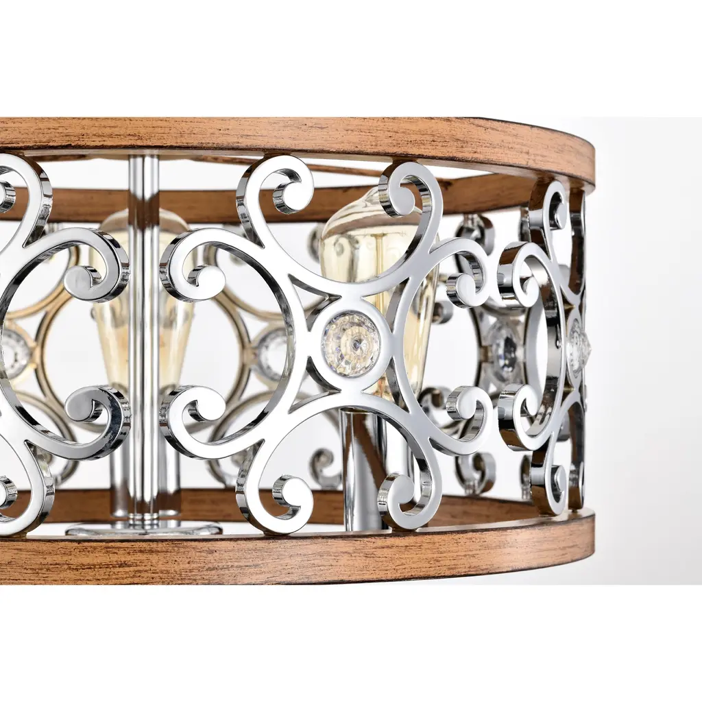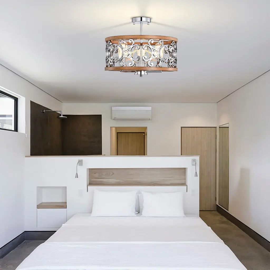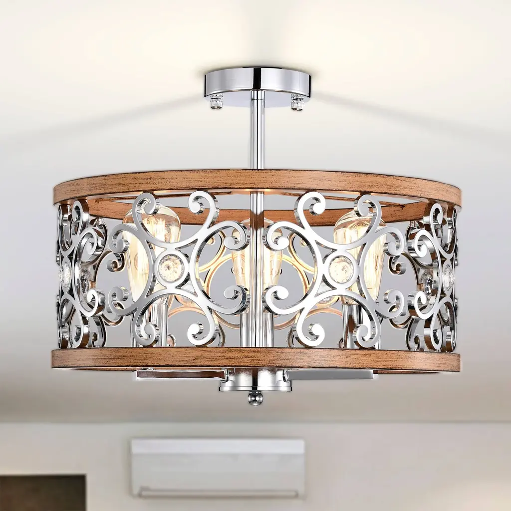 This matte black imitation wood grain Semi Flush Mount Ceiling Light is the perfect blend of classic exquisiteness and modern boldness. The drum-shaped with crystal fixture has a outer shade that adds a delightful dimensional aspect and livens up your ceiling.Features:Dimensions:Note:This light is not damp rated. Whether it is dimmable or not depends on the light bulb not on the light fixture itself. If you use dimmable light bulb and a dimmer switch, it will be dimmable. This fixture does need to be hard wired. Assembly is required. Professional installation is recommended. This light cannot be installed on a sloped or vaulted ceiling.