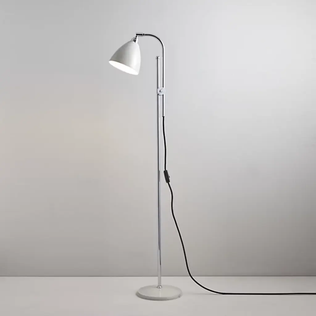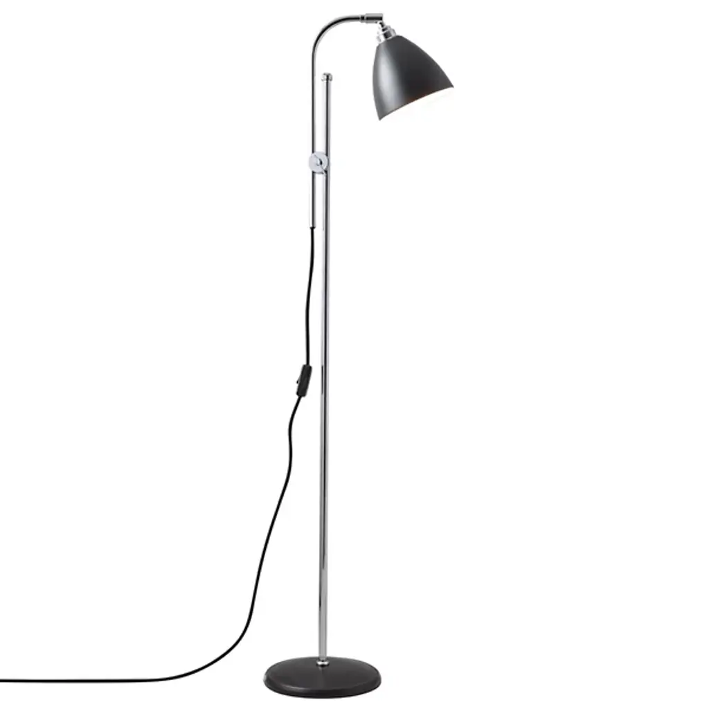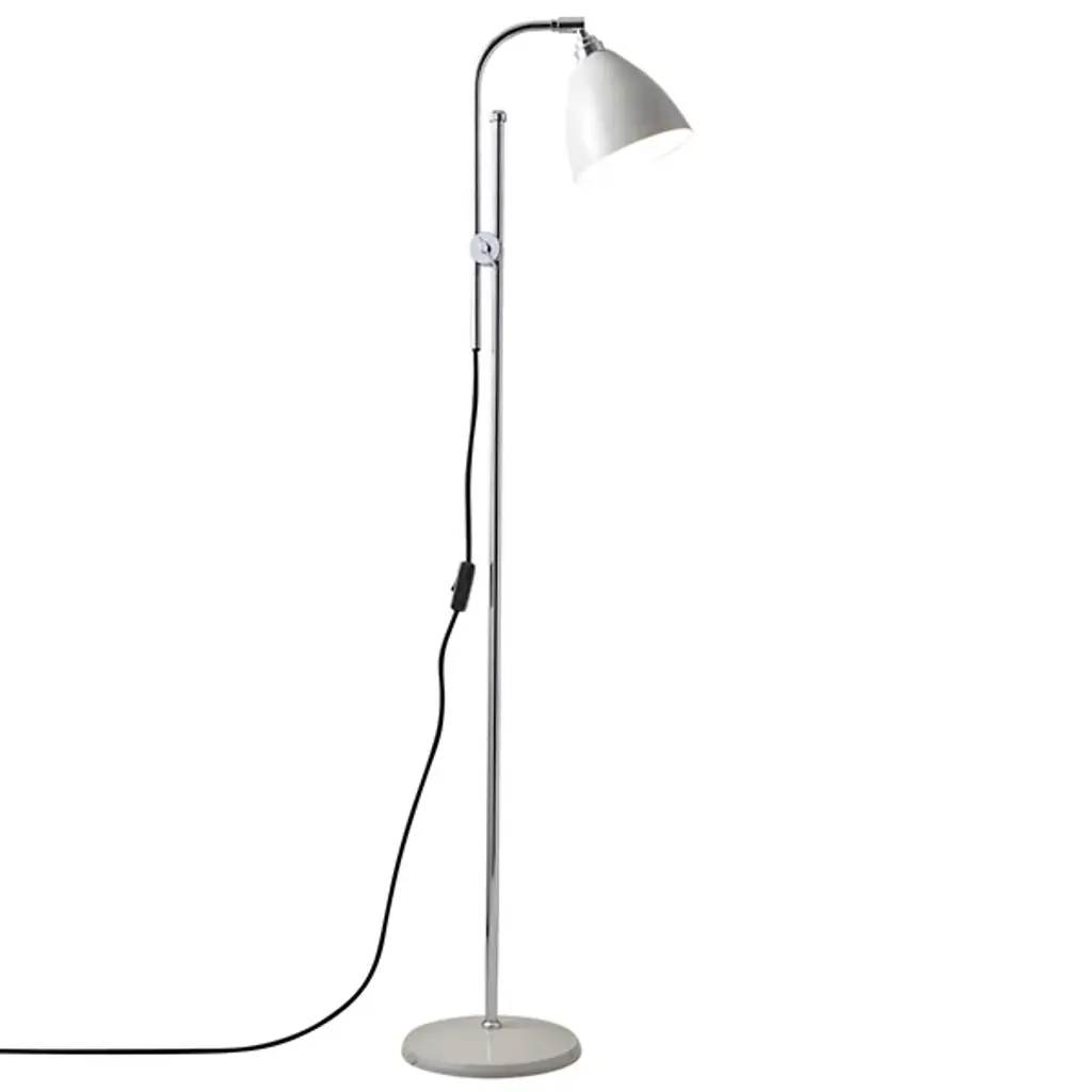 Constructed with pure functionality in mind, the Original BTC lighting Task Floor Light is a classic silhouette with refined industrial details. Hand-spun in the heart of England, the smooth aluminum shade and base are painted with a glossy finish and complemented by a polished chrome adjustable stem that is nostalgic of sober 1940s design. Equipped with sophisticated mechanics, light is able to be aimed and distributed according to any task oriented need.