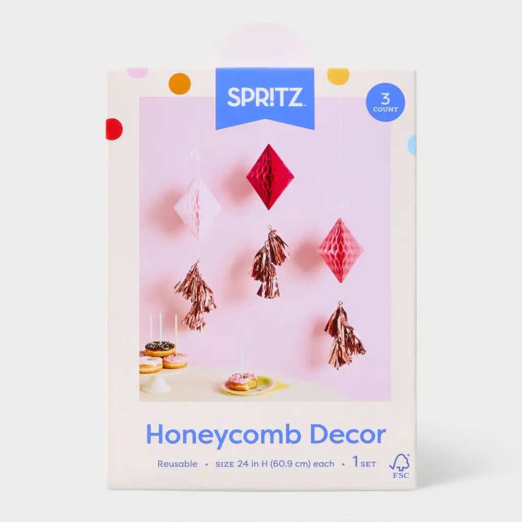 When you're planning a party, it never hurts to add a little shine and movement to your event decor, like with these Tassel and Honeycomb Party Decorations from Spritz™. This set of three honeycomb-shaped party decorations is great to hang to catch the light on a dance floor, or just to add festive vibes to your home, office or classroom for your next party. The warm color scheme in shades of red and pink is perfect for a variety of events, from graduation parties, to wedding showers, to birthdays and more. And with built-in loops for hanging, these lightweight honeycomb party decorations are easy to hang when you're prepping for the party and to take down when your guests go home.Spritz™: Pops of joy that make the moment™