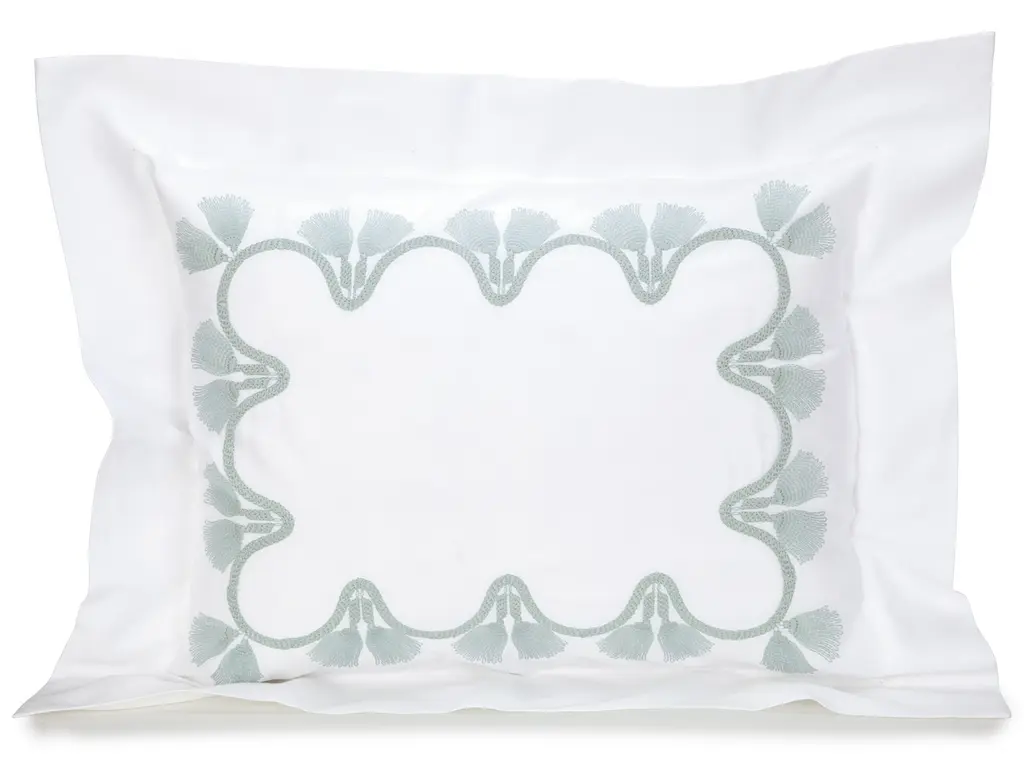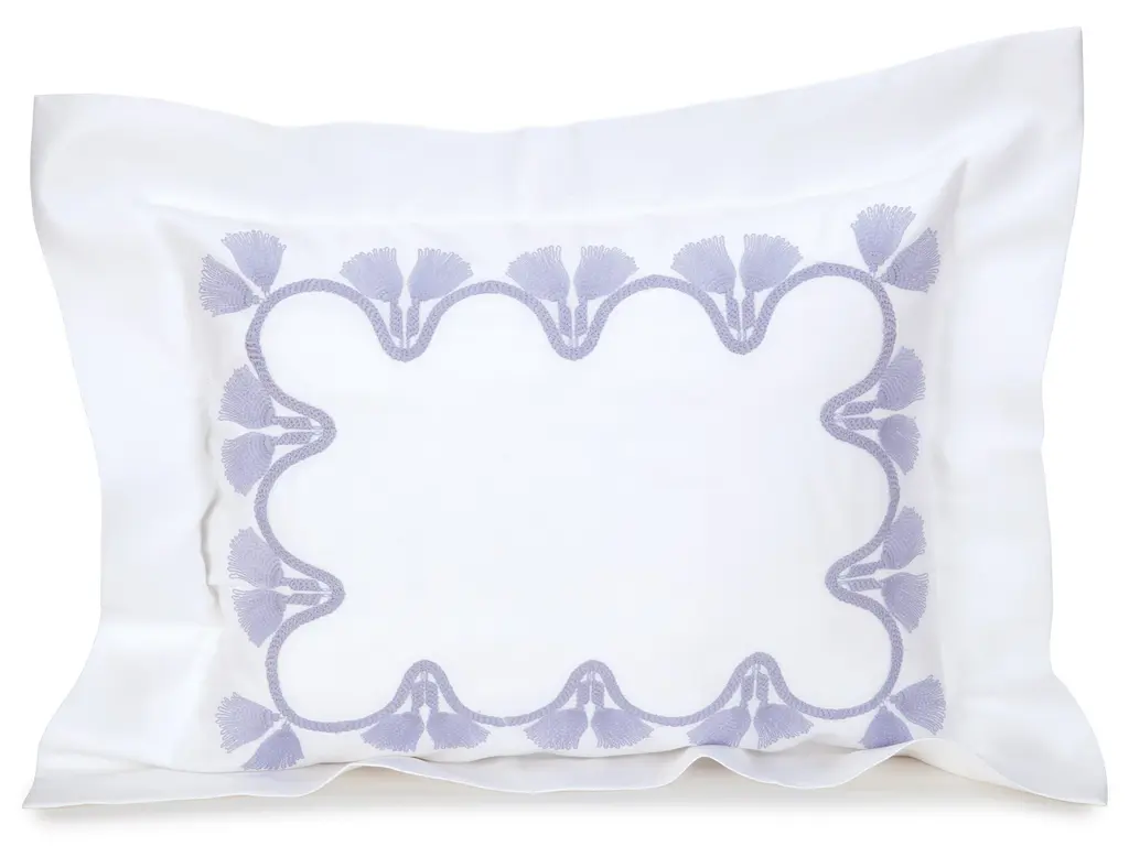 Renowned through the centuries for their decorative value, tassels are reinvented here in Lilac or Turquoise embroidery on fine White 100% Egyptian cotton sateen, 600 thread count. Superbly crafted in Italy, the exquisite effect of tassels dangling from ornamental rope brings a touch of royalty into your home.