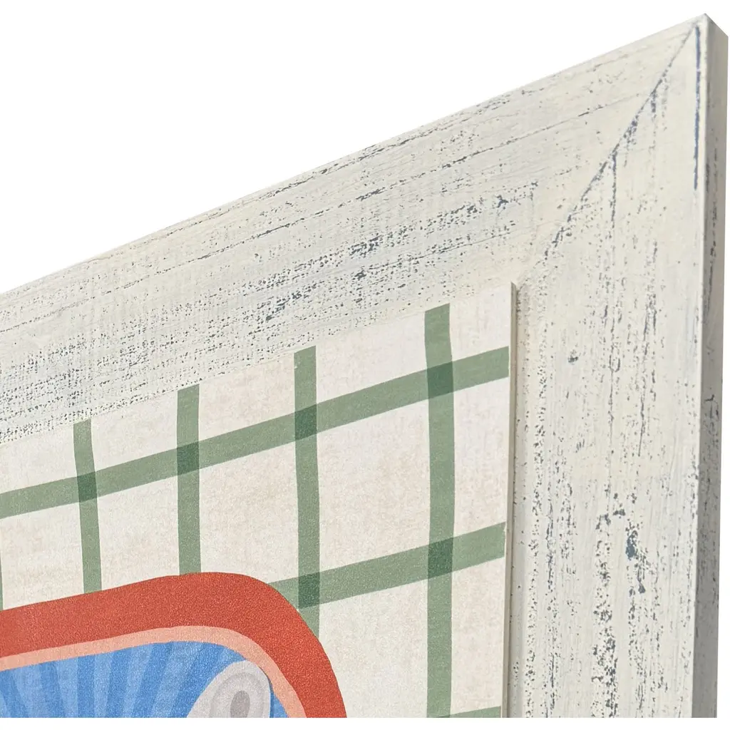 A vintage fish tin giclee is overlaid with a hand applied enhanced gel finish and mounted on a hand painted white wood frame with distressing.