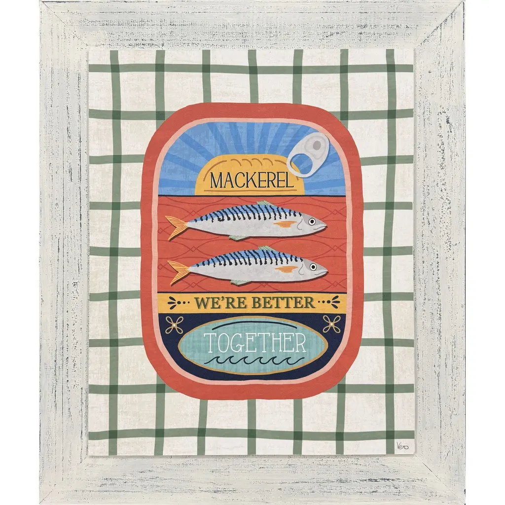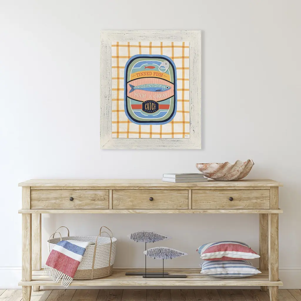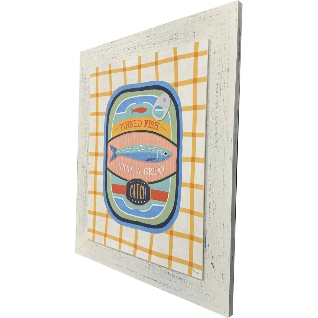A vintage fish tin giclee is overlaid with a hand applied enhanced gel finish and mounted on a hand painted white wood frame with distressing.