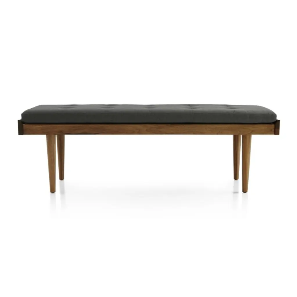 Picking up on the best of mid-century design, Tate streamlines a striking slatted bench with smart conical legs in beautiful solid walnut. Outfitted with a charcoal grey tufted cushion, the bench brings its classic modern style to any room in the house. Designed by Blake Tovin, the Tate Walnut Slatted Bench with Charcoal Cushion is a Crate and Barrel exclusive.
