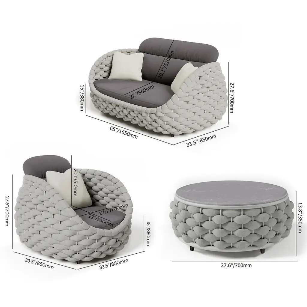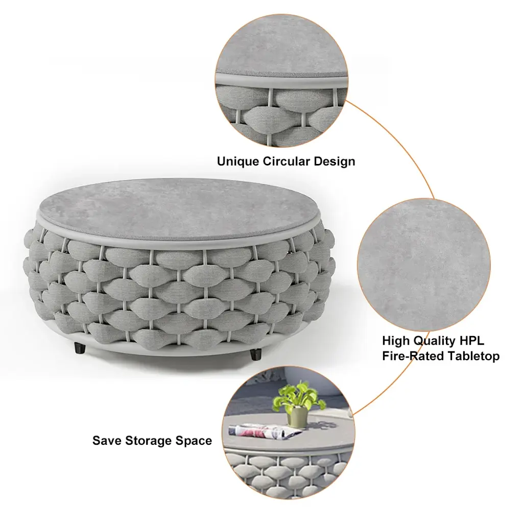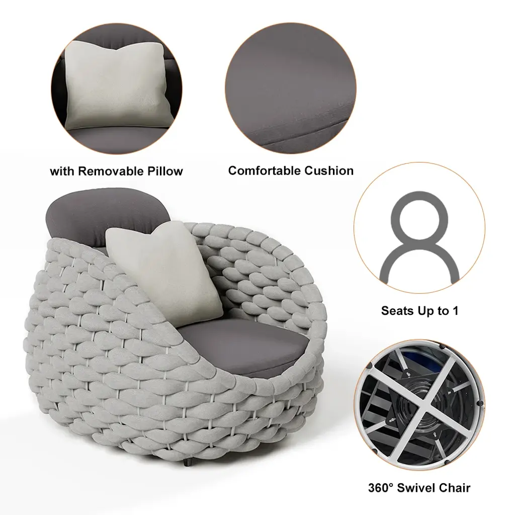 Round shapes and artfully woven olefin rope in soft shades of gray add modern charm to your outdoor space. A lightweight aluminum frame, rotating base, and durable stone-look tabletop offer practical elegance. All materials are weatherproof, allowing you to enjoy more time outdoors.