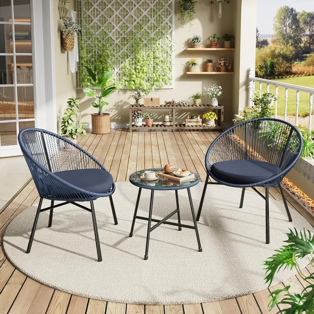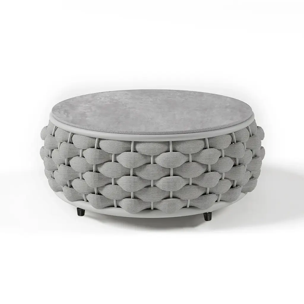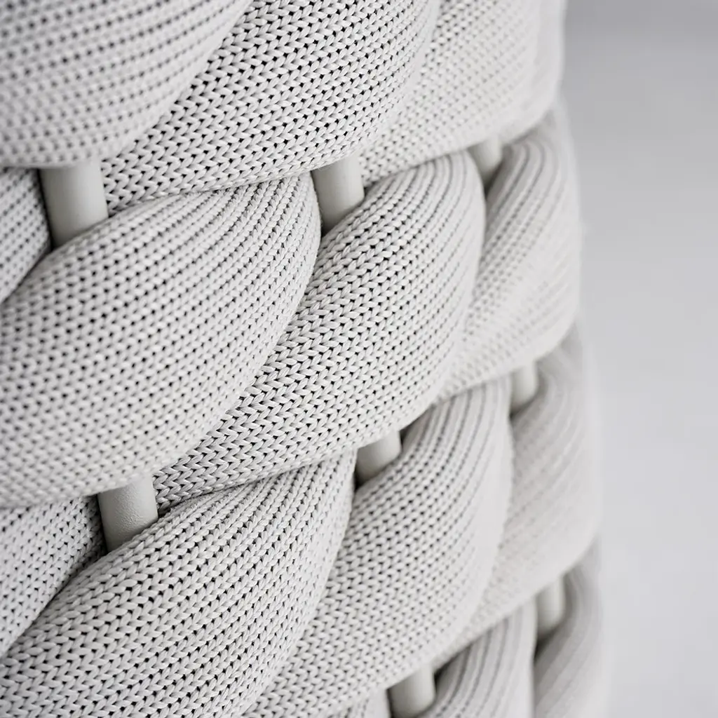 Round shapes and artfully woven olefin rope in soft shades of gray add modern charm to your outdoor space. A lightweight aluminum frame, rotating base, and durable stone-look tabletop offer practical elegance. All materials are weatherproof, allowing you to enjoy more time outdoors.