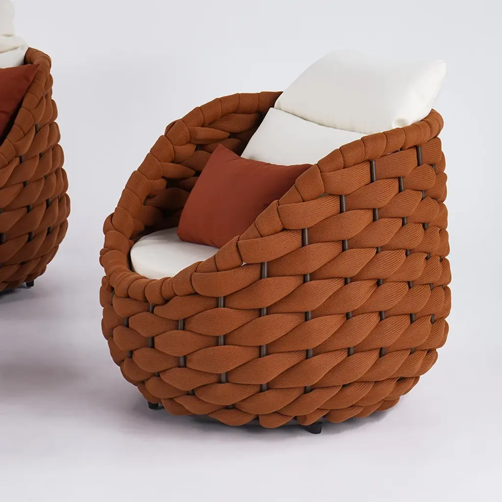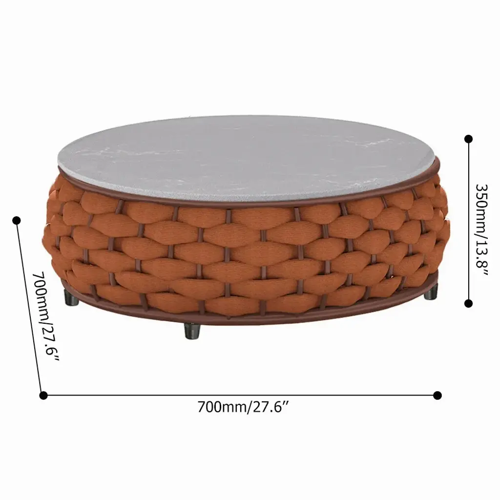 Round shapes and artfully woven olefin rope in warm brown tones add modern charm to your outdoor space. A lightweight aluminum frame, rotating base, and durable stone-look tabletop offer practical elegance. All materials are weatherproof, allowing you to enjoy more time outdoors.